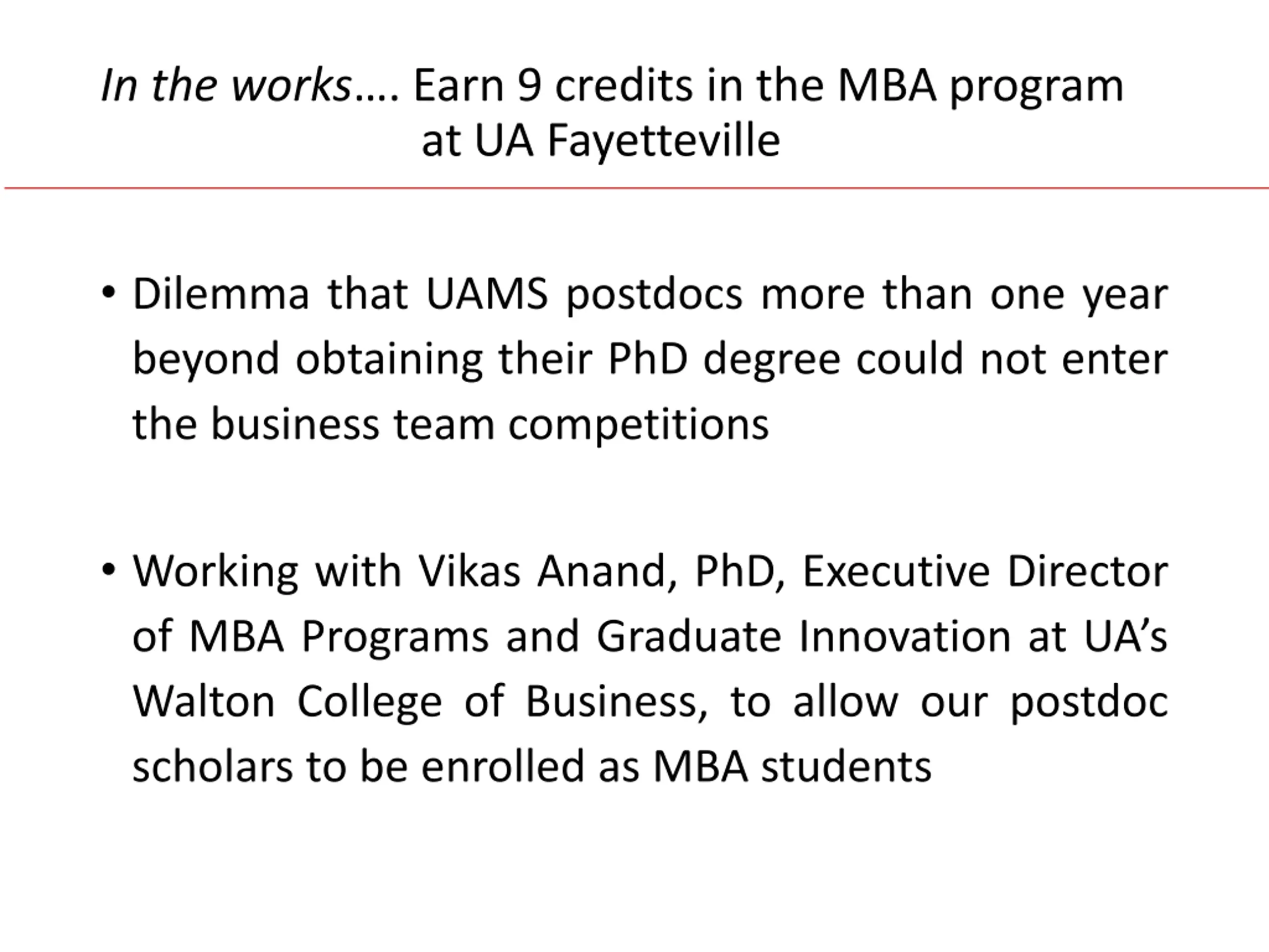 In the works. Earn 9 credits in the MBA program at UA Fayetteville Dilemma that UAMS postdocs more than one year beyond obtaining their PhD degree could not enter the business team competitions Working with Vikas Anand, PhD, Executive Director of MBA Programs and Graduate Innovation at UA s Walton College of Business, to allow our postdoc scholars to be enrolled as MBA students