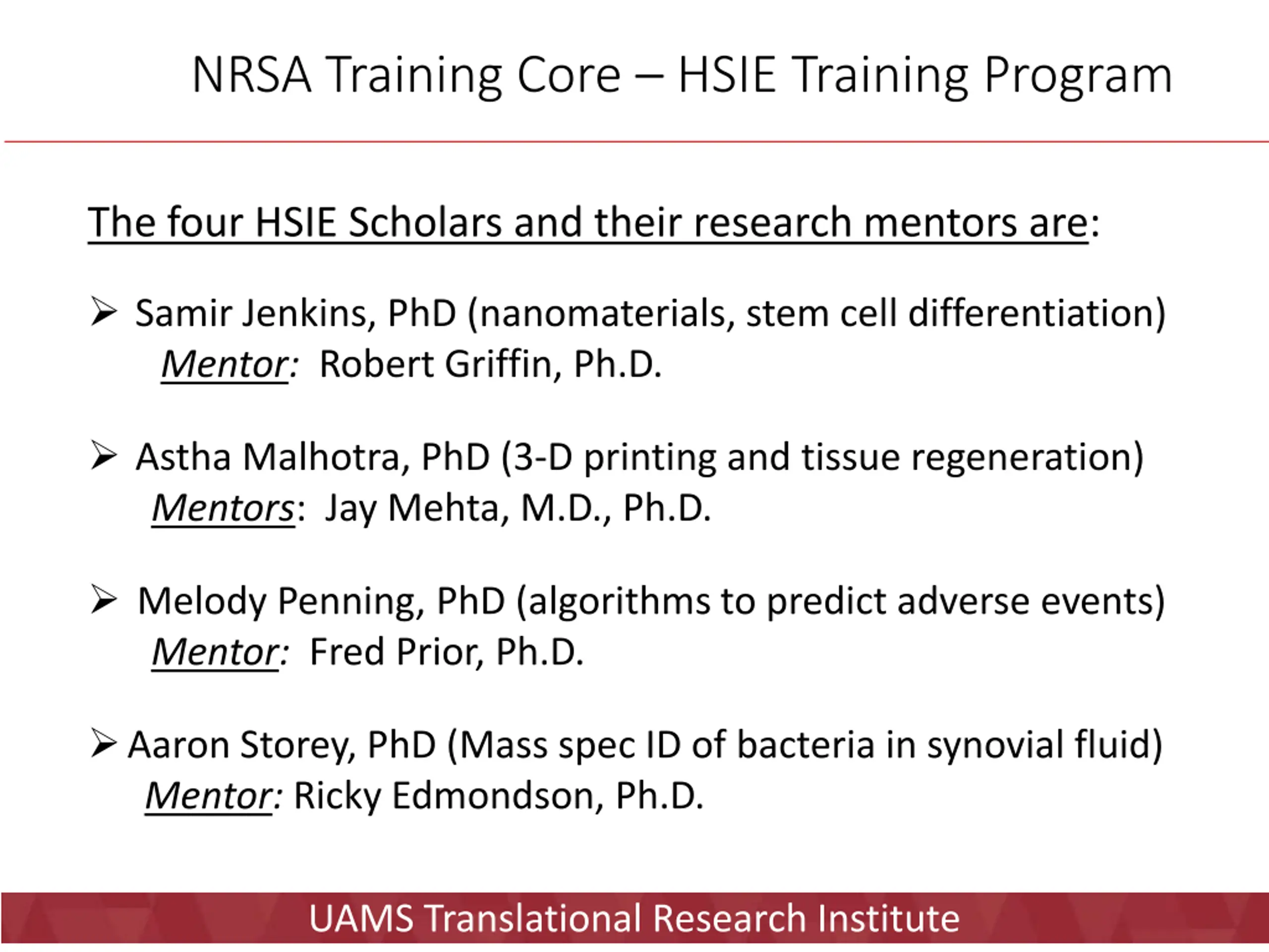 NRSA Training Core HSIE Training Program The four HSIE Scholars and their research mentors are: Samir Jenkins, PhD (nanomaterials, stem cell differentiation) Mentor: Robert Griffin, Ph.D. Astha Malhotra, PhD (3-D printing and tissue regeneration) Mentors: Jay Mehta, M.D., Ph.D. Melody Penning, PhD (algorithms to predict adverse events) Mentor: Fred Prior, Ph.D. Aaron Storey, PhD (Mass spec ID of bacteria in synovial fluid) Mentor: Ricky Edmondson, Ph.D. UAMS Translational Research Institute