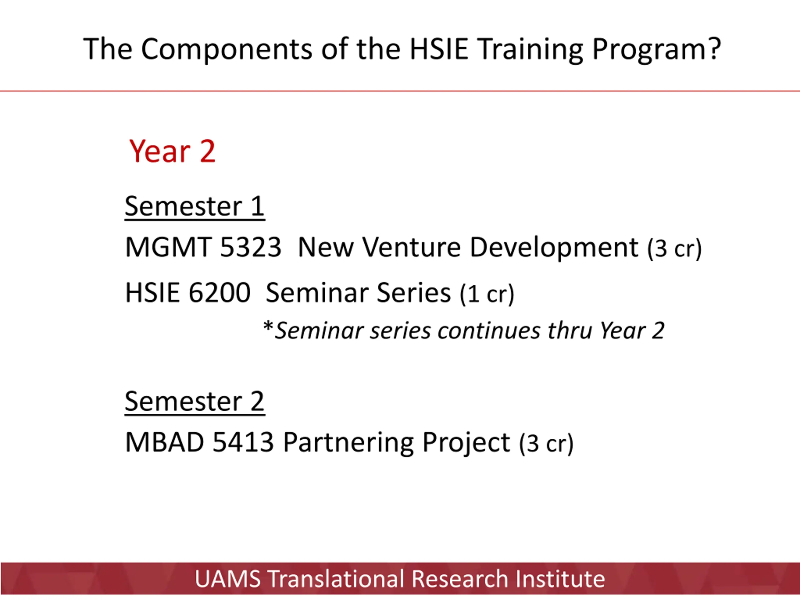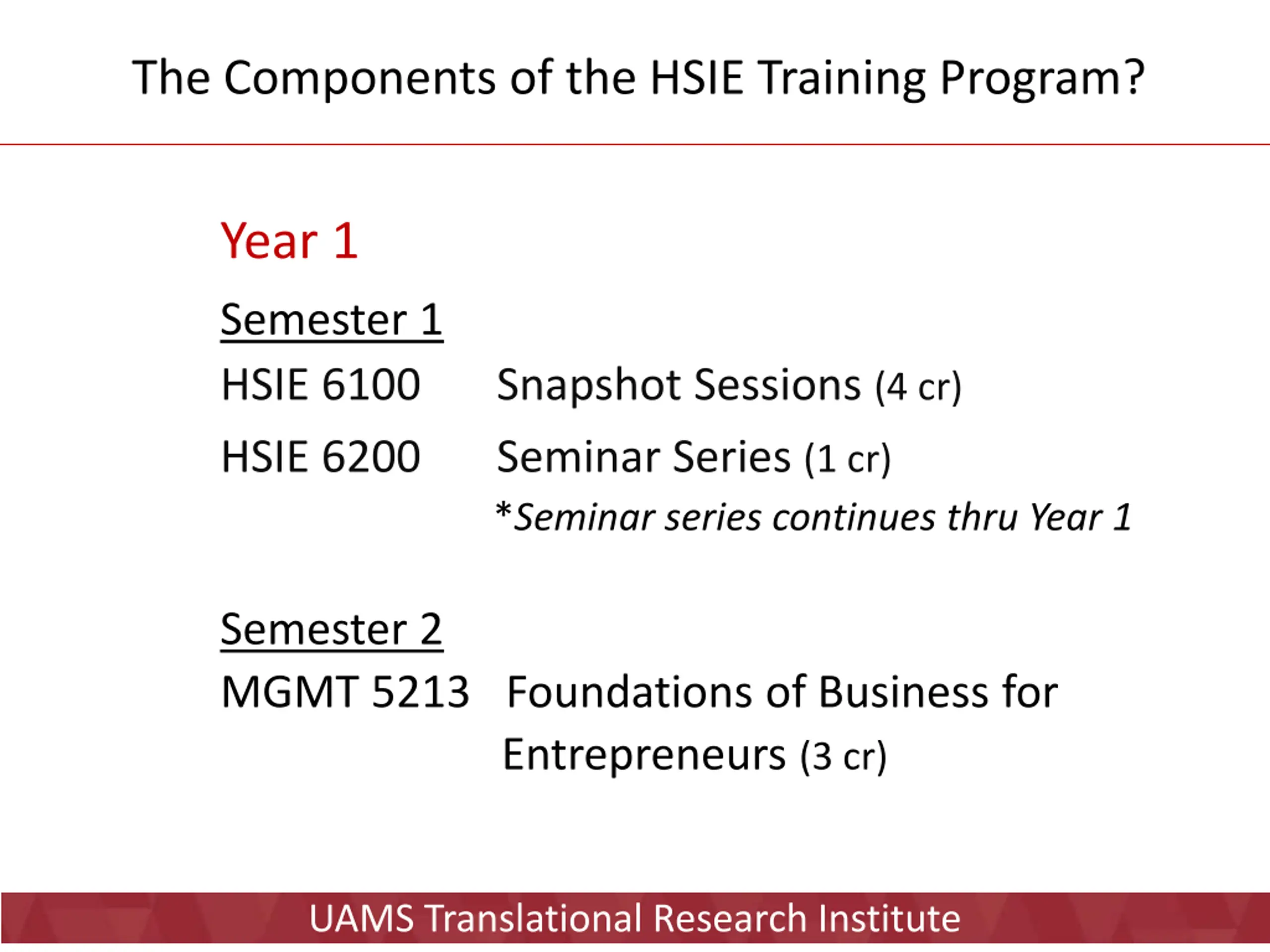 The Components of the HSIE Training Program? Year 1 Semester 1 HSIE 6100 Snapshot Sessions (4 cr) HSIE 6200 Seminar Series (1 cr) *Seminar series continues thru Year 1 Semester 2 MGMT 5213 Foundations of Business for Entrepreneurs (3 cr) UAMS Translational Research Institute
