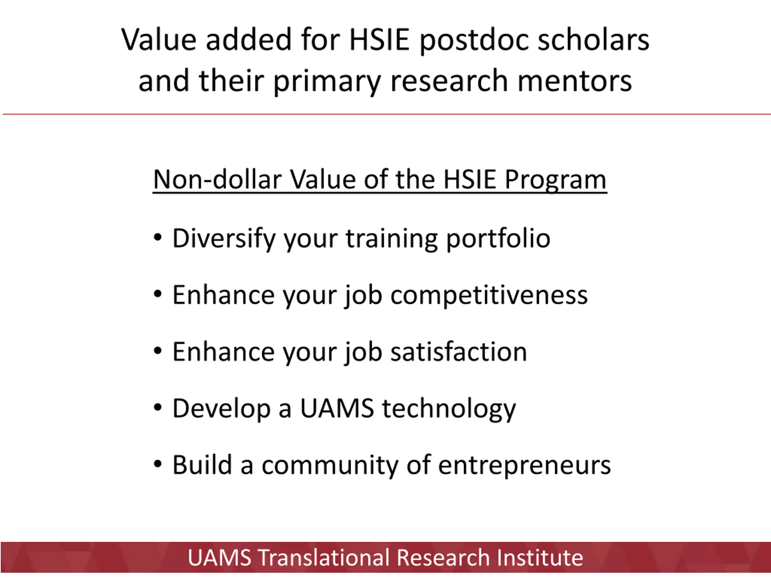 Value added for HSIE postdoc scholars and their primary research mentors Non-dollar Value of the HSIE Program Diversify your training portfolio Enhance your job competitiveness Enhance your job satisfaction Develop a UAMS technology Build a community of entrepreneurs UAMS Translational Research Institute