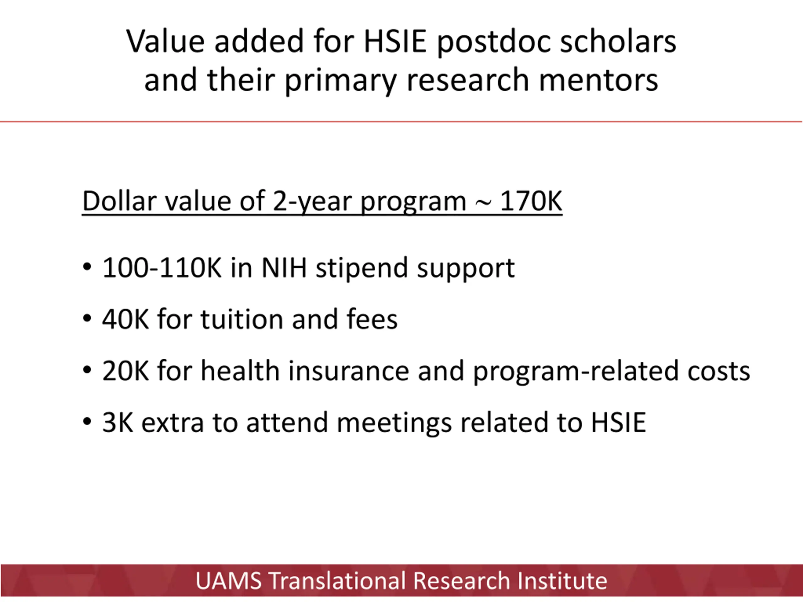 Value added for HSIE postdoc scholars and their primary research mentors Dollar value of 2-year program 170K 100-110K in NIH stipend support 40K for tuition and fees 20K for health insurance and program-related costs 3K extra to attend meetings related to HSIE UAMS Translational Research Institute