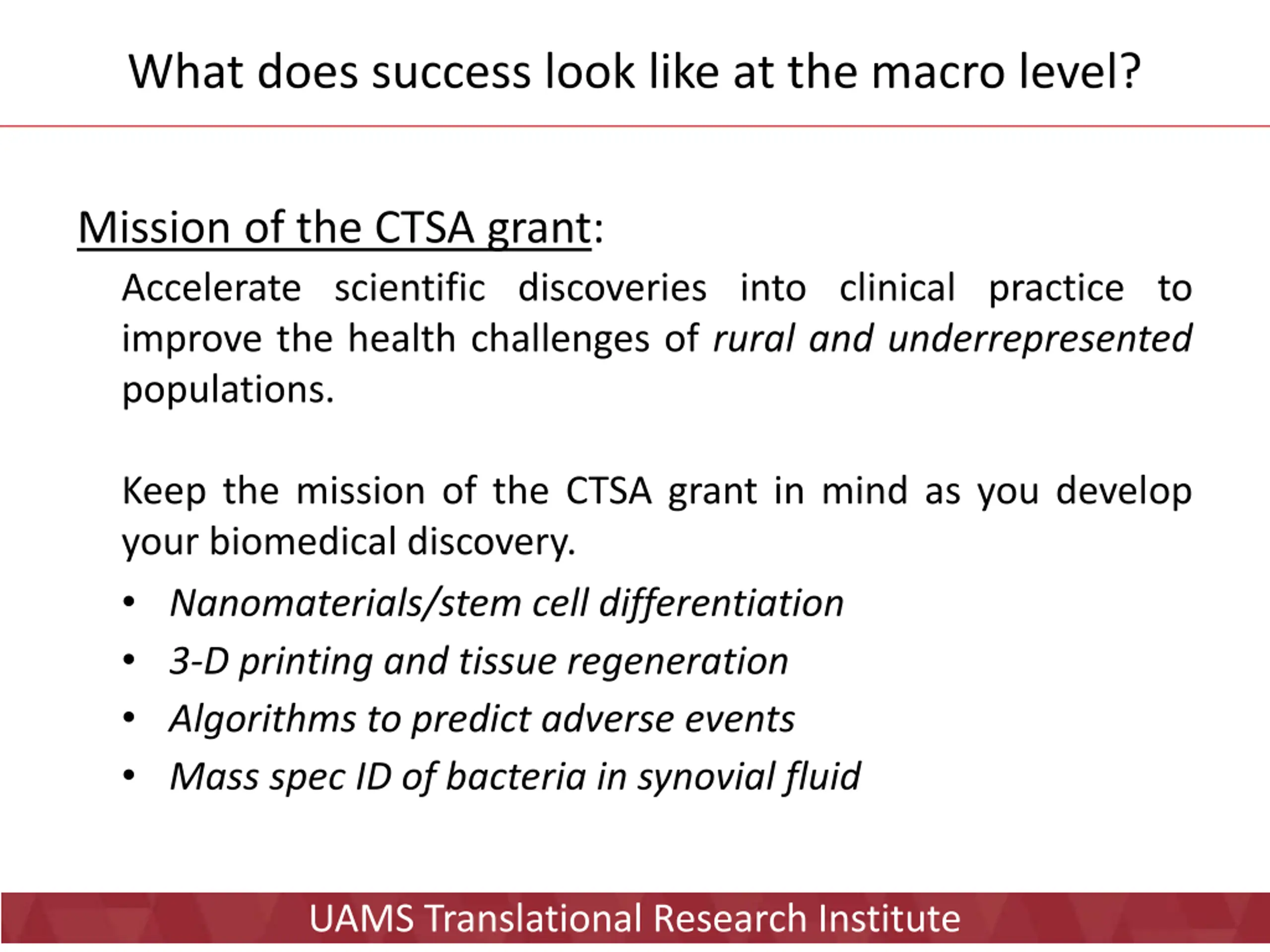 What does success look like at the macro level? Mission of the CTSA grant: Accelerate scientific discoveries into clinical practice to improve the health challenges of rural and underrepresented populations. Keep the mission of the CTSA grant in mind as you develop your biomedical discovery. Nanomaterials/stem cell differentiation 3-D printing and tissue regeneration Algorithms to predict adverse events Mass spec ID of bacteria in synovial fluid UAMS Translational Research Institute
