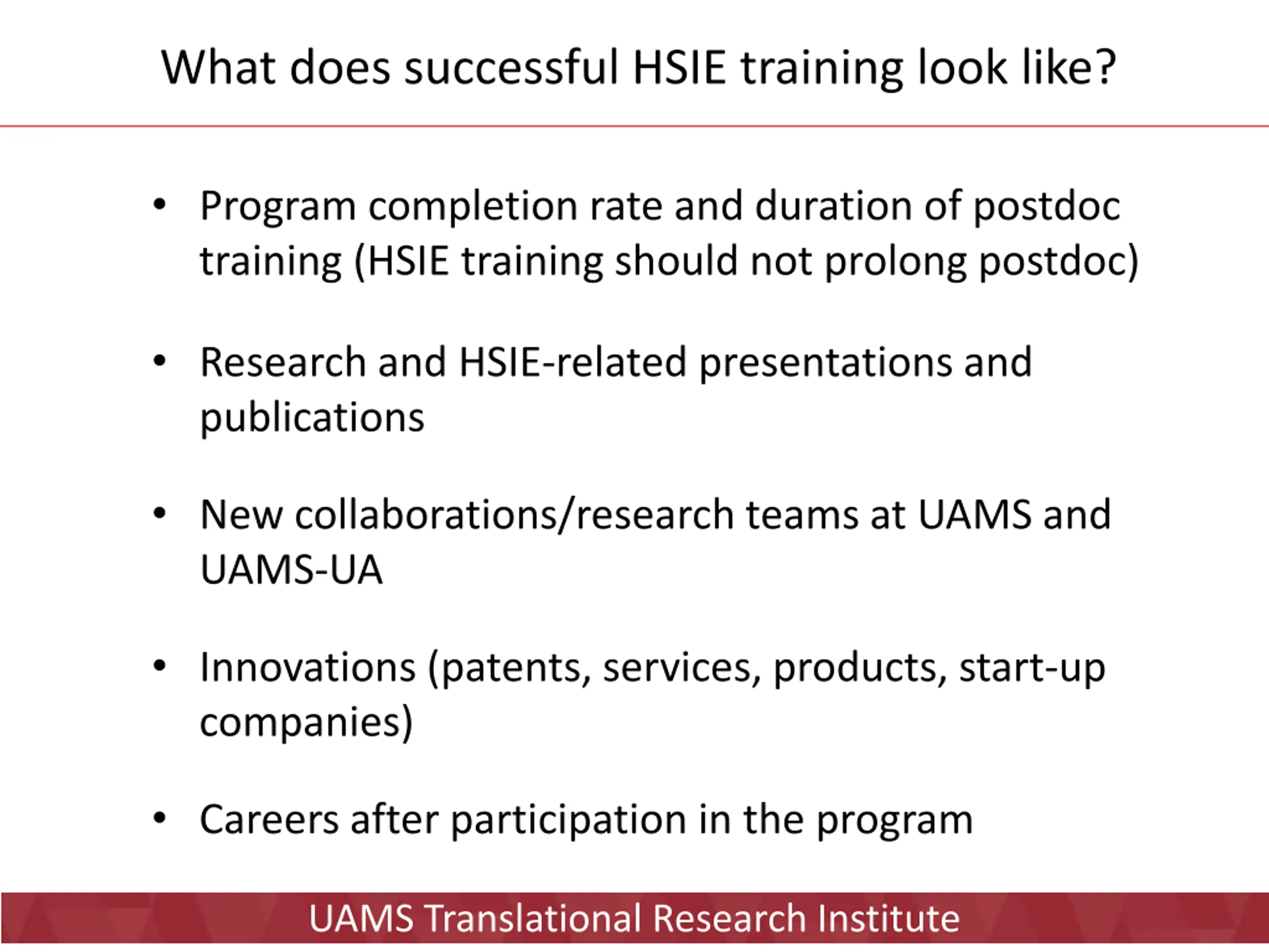 What does successful HSIE training look like? Program completion rate and duration of postdoc training (HSIE training should not prolong postdoc) Research and HSIE-related presentations and publications New collaborations/research teams at UAMS and UAMS-UA Innovations (patents, services, products, start-up companies) Careers after participation in the program UAMS Translational Research Institute