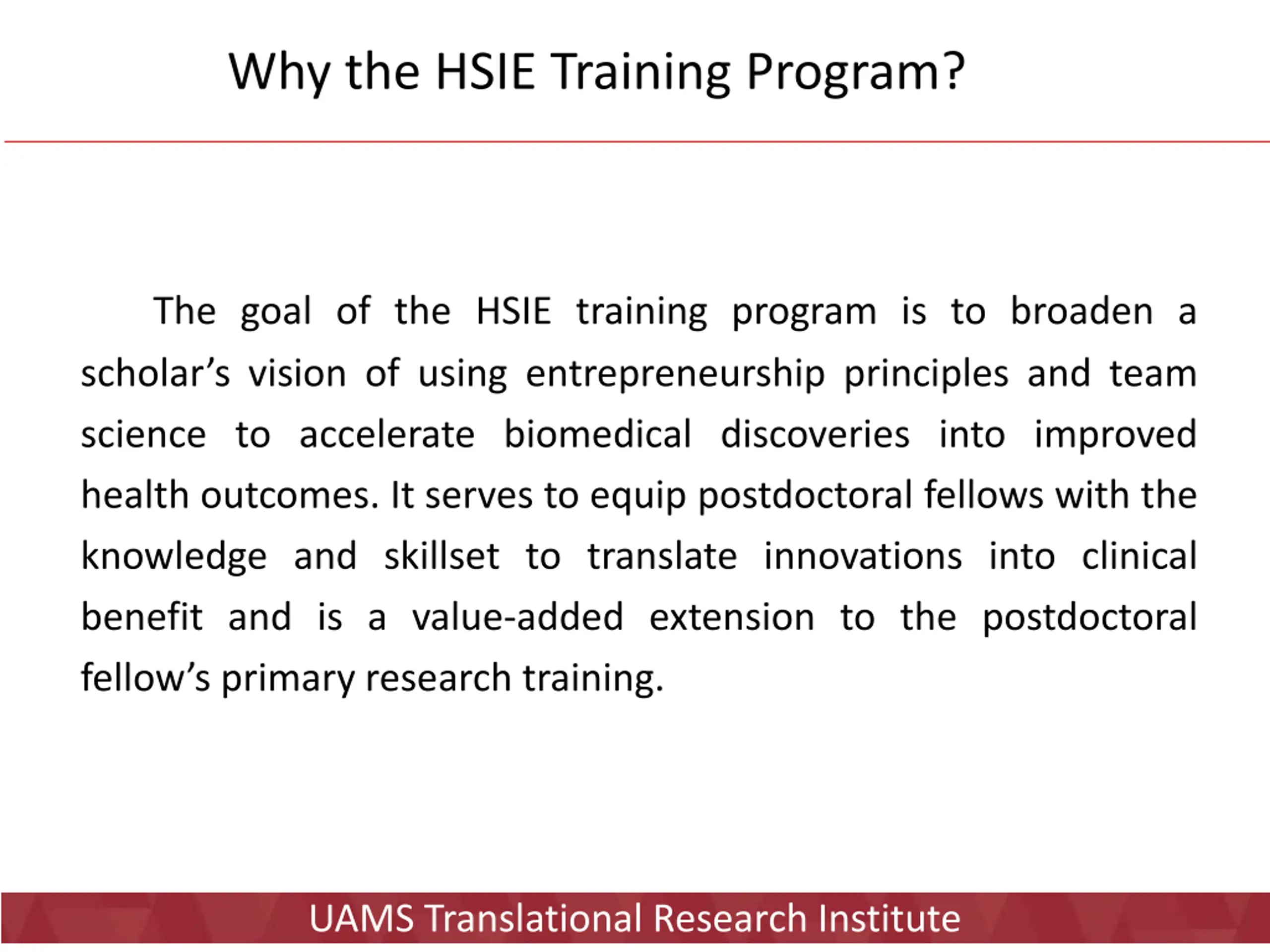 Why the HSIE Training Program? The goal of the HSIE training program is to broaden a scholar s vision of using entrepreneurship principles and team science to accelerate biomedical discoveries into improved health outcomes. It serves to equip postdoctoral fellows with the knowledge and skillset to translate innovations into clinical benefit and is a value-added extension to the postdoctoral fellow s primary research training. UAMS Translational Research Institute