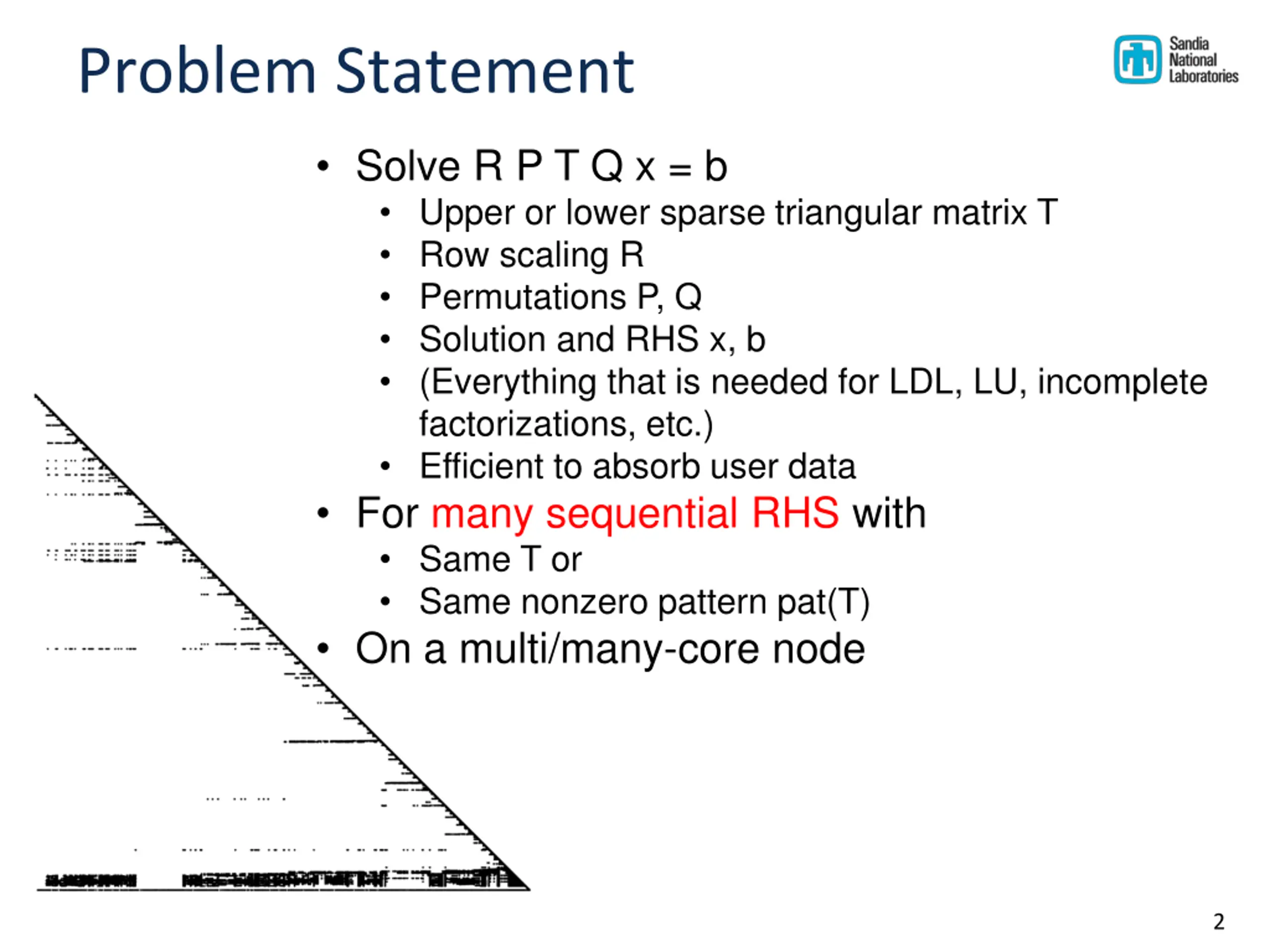 Problem Statement Solve R P T Q x = b Upper or lower sparse triangular matrix T Row scaling R Permutations P, Q Solution and RHS x, b (Everything that is needed for LDL, LU, incomplete factorizations, etc.) Efficient to absorb user data For many sequential RHS with Same T or Same nonzero pattern pat(T) On a multi/many-core node 2