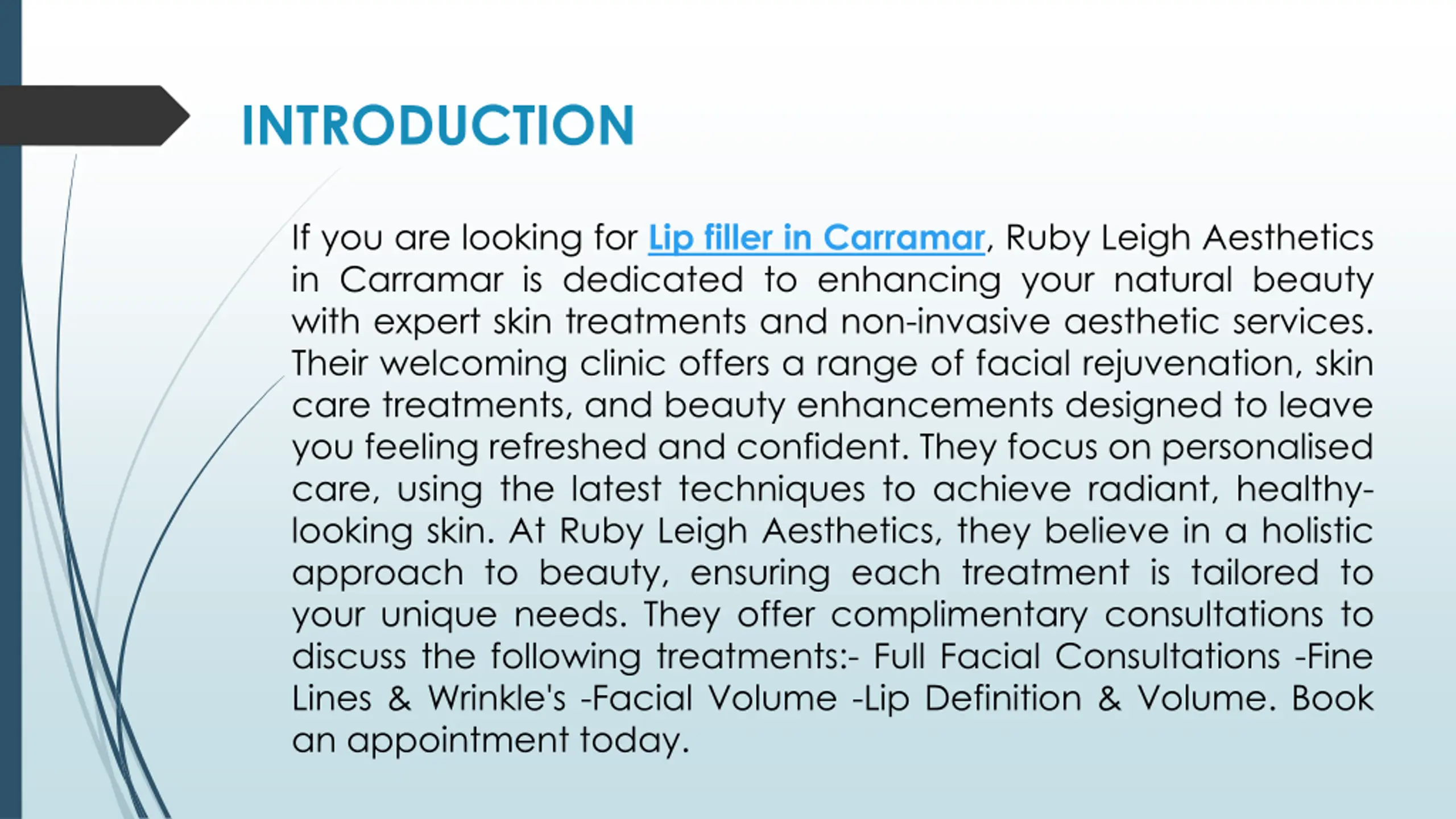 INTRODUCTION If you are looking for Lip filler in Carramar, Ruby Leigh Aesthetics in Carramar is dedicated to enhancing your natural beauty with expert skin treatments and non-invasive aesthetic services. Their welcoming clinic offers a range of facial rejuvenation, skin care treatments, and beauty enhancements designed to leave you feeling refreshed and confident. They focus on personalised care, using the latest techniques to achieve radiant, healthy- looking skin. At Ruby Leigh Aesthetics, they believe in a holistic approach to beauty, ensuring each treatment is tailored to your unique needs. They offer complimentary consultations to discuss the following treatments:- Full Facial Consultations -Fine Lines & Wrinkle's -Facial Volume -Lip Definition & Volume. Book an appointment today.