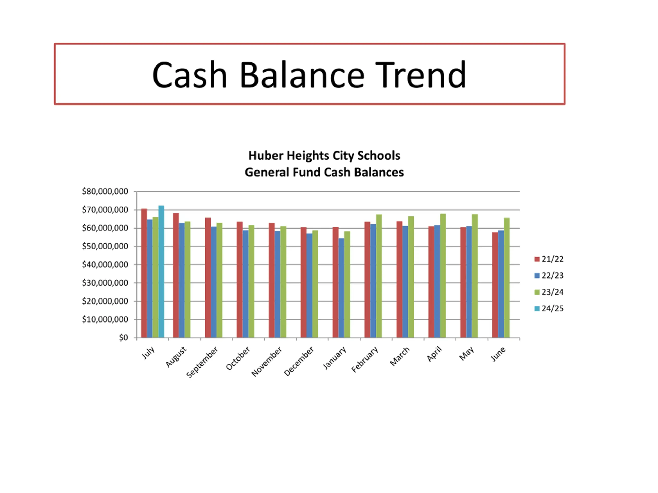 Cash Balance Trend Huber Heights City Schools General Fund Cash Balances $80,000,000 $70,000,000 $60,000,000 $50,000,000 21/22 $40,000,000 22/23 $30,000,000 23/24 $20,000,000 24/25 $10,000,000 $0