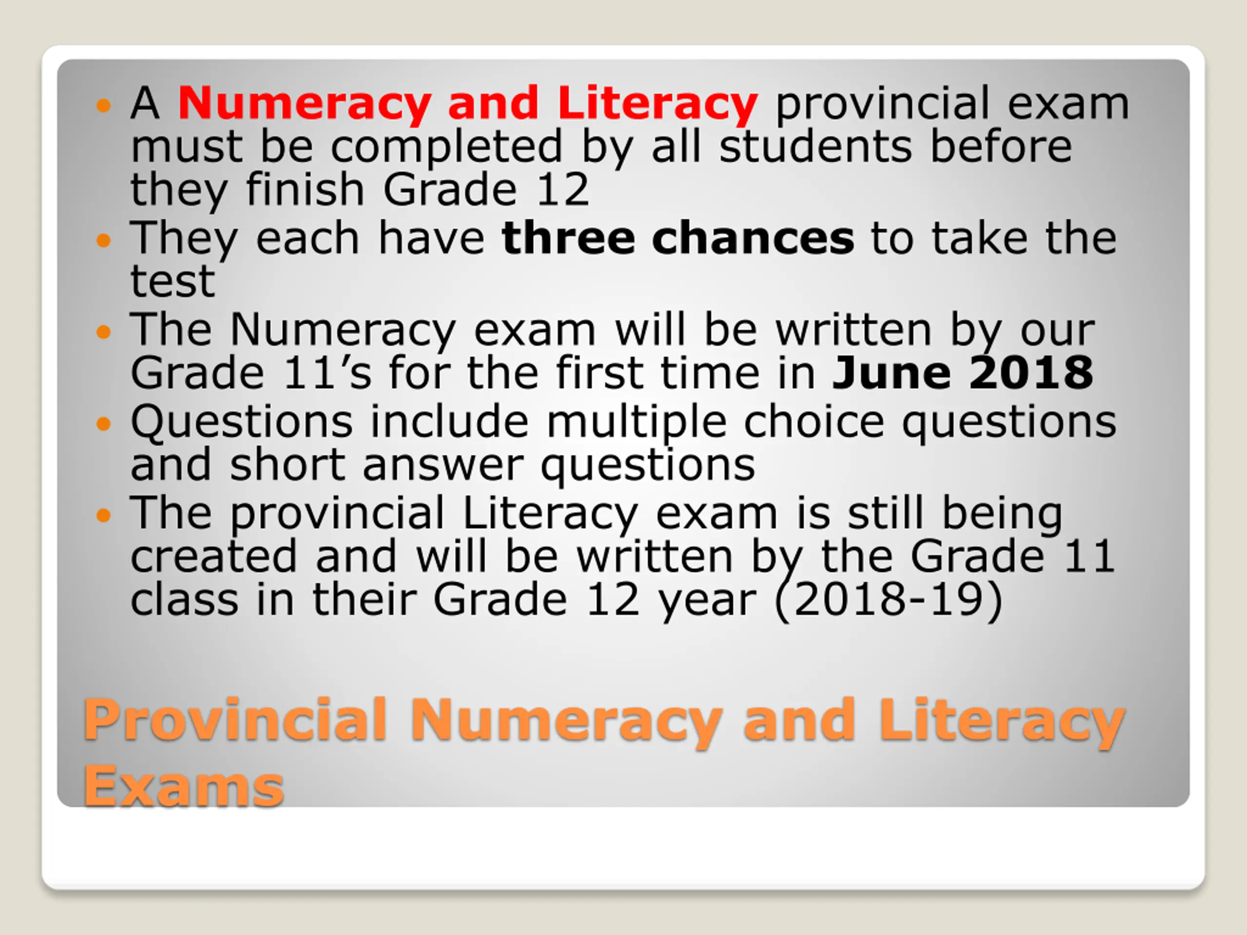 A Numeracy and Literacy provincial exam must be completed by all students before they finish Grade 12 They each have three chances to take the test The Numeracy exam will be written by our Grade 11 s for the first time in June 2018 Questions include multiple choice questions and short answer questions The provincial Literacy exam is still being created and will be written by the Grade 11 class in their Grade 12 year (2018-19) Provincial Numeracy and Literacy Exams