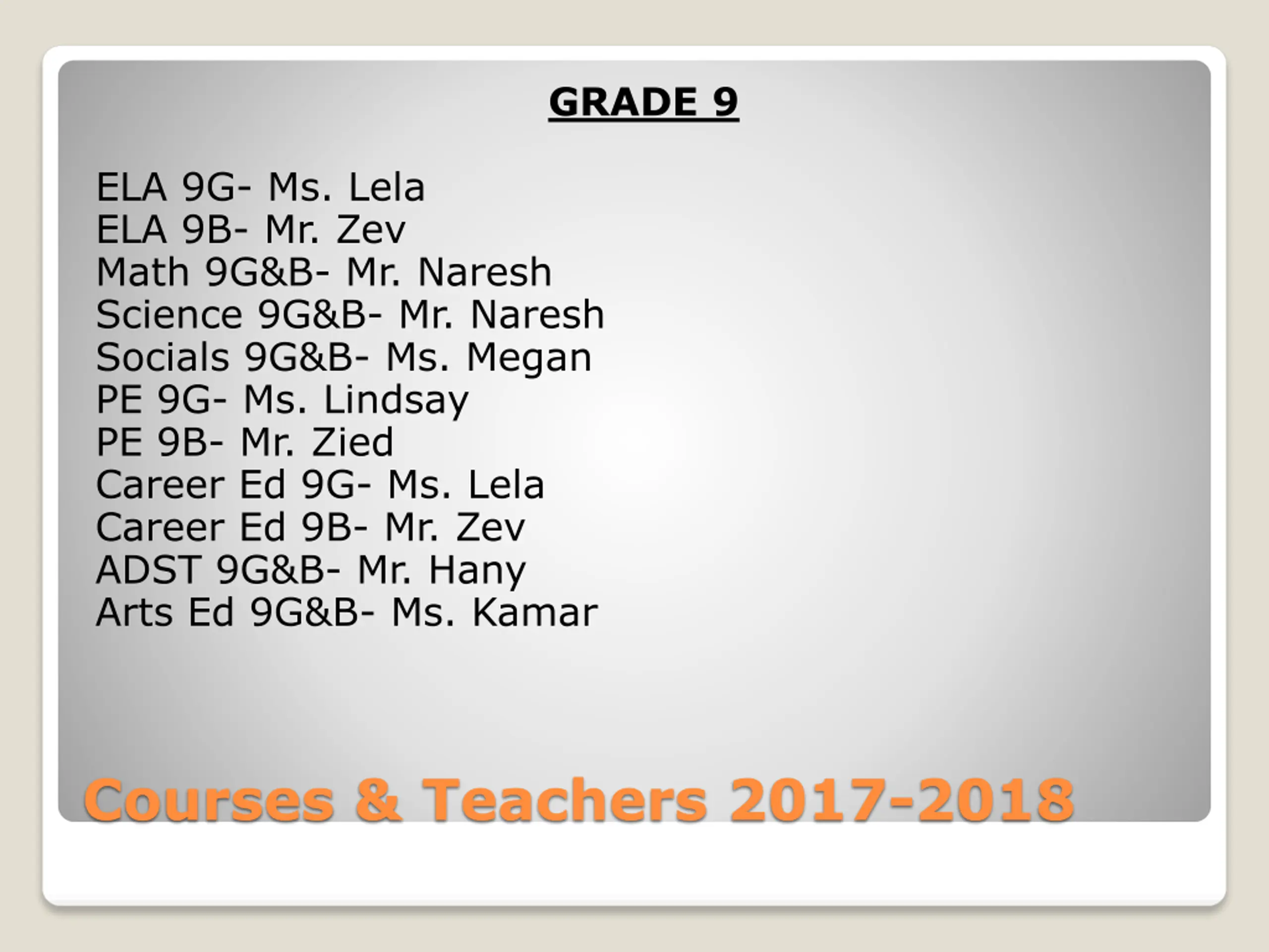 GRADE 9 ELA 9G- Ms. Lela ELA 9B- Mr. Zev Math 9G&B- Mr. Naresh Science 9G&B- Mr. Naresh Socials 9G&B- Ms. Megan PE 9G- Ms. Lindsay PE 9B- Mr. Zied Career Ed 9G- Ms. Lela Career Ed 9B- Mr. Zev ADST 9G&B- Mr. Hany Arts Ed 9G&B- Ms. Kamar Courses & Teachers 2017-2018