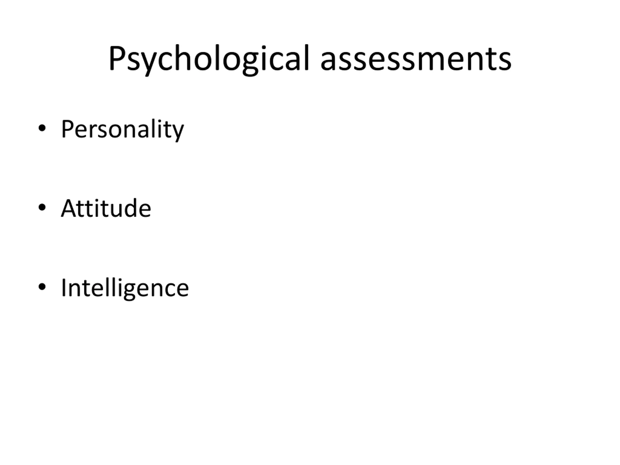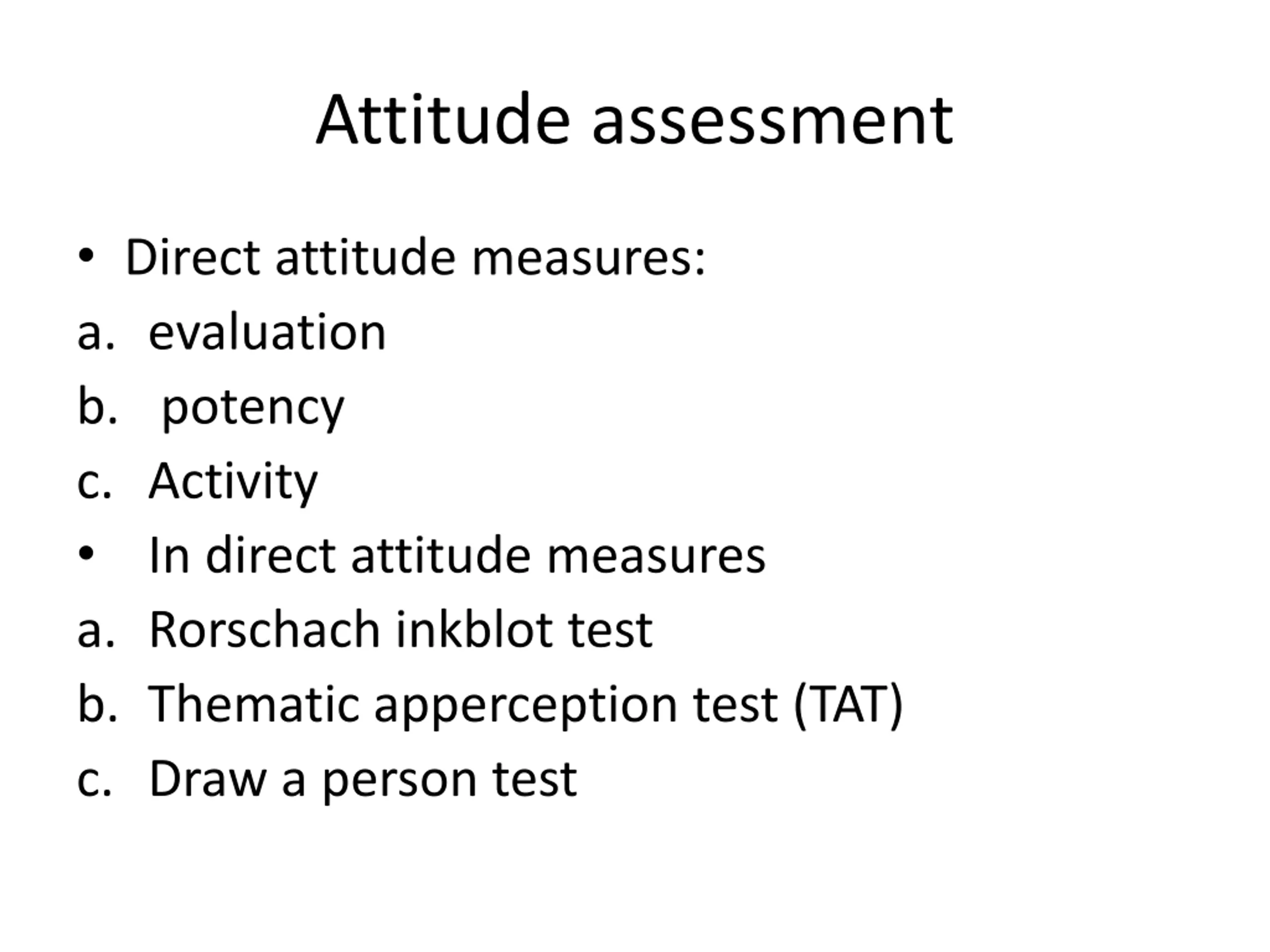 Attitude assessment Direct attitude measures: a. evaluation b. potency c. Activity In direct attitude measures a. Rorschach inkblot test b. Thematic apperception test (TAT) c. Draw a person test