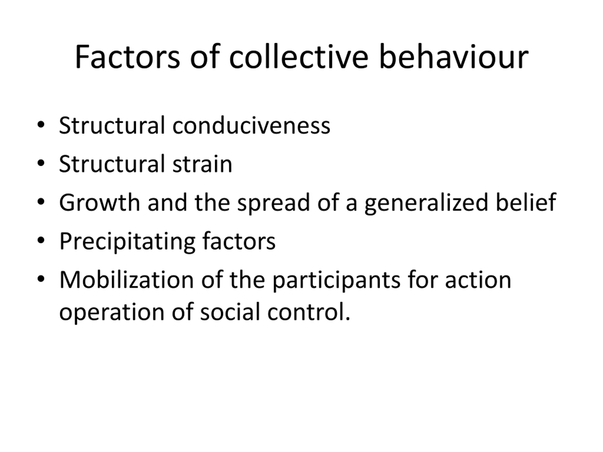 Factors of collective behaviour Structural conduciveness Structural strain Growth and the spread of a generalized belief Precipitating factors Mobilization of the participants for action operation of social control.