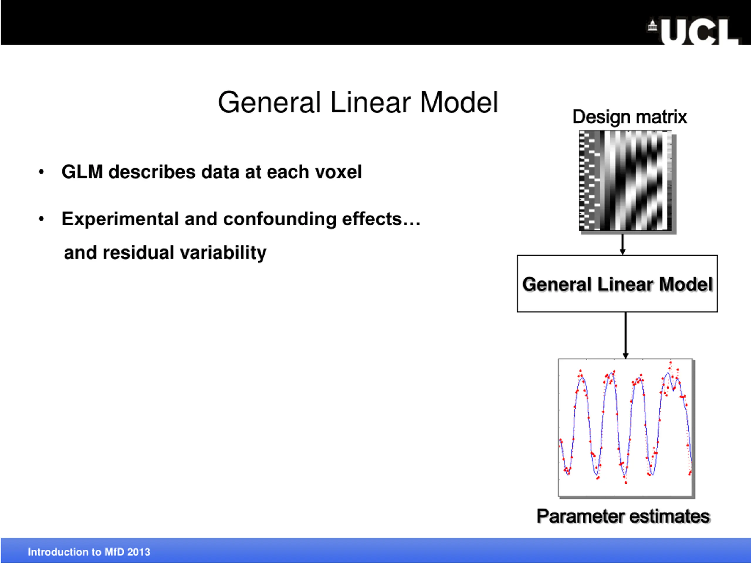 General Linear Model Design matrix Design matrix GLM describes data at each voxel Experimental and confounding effects and residual variability General Linear Model Parameter estimates Parameter estimates Introduction to MfD 2013