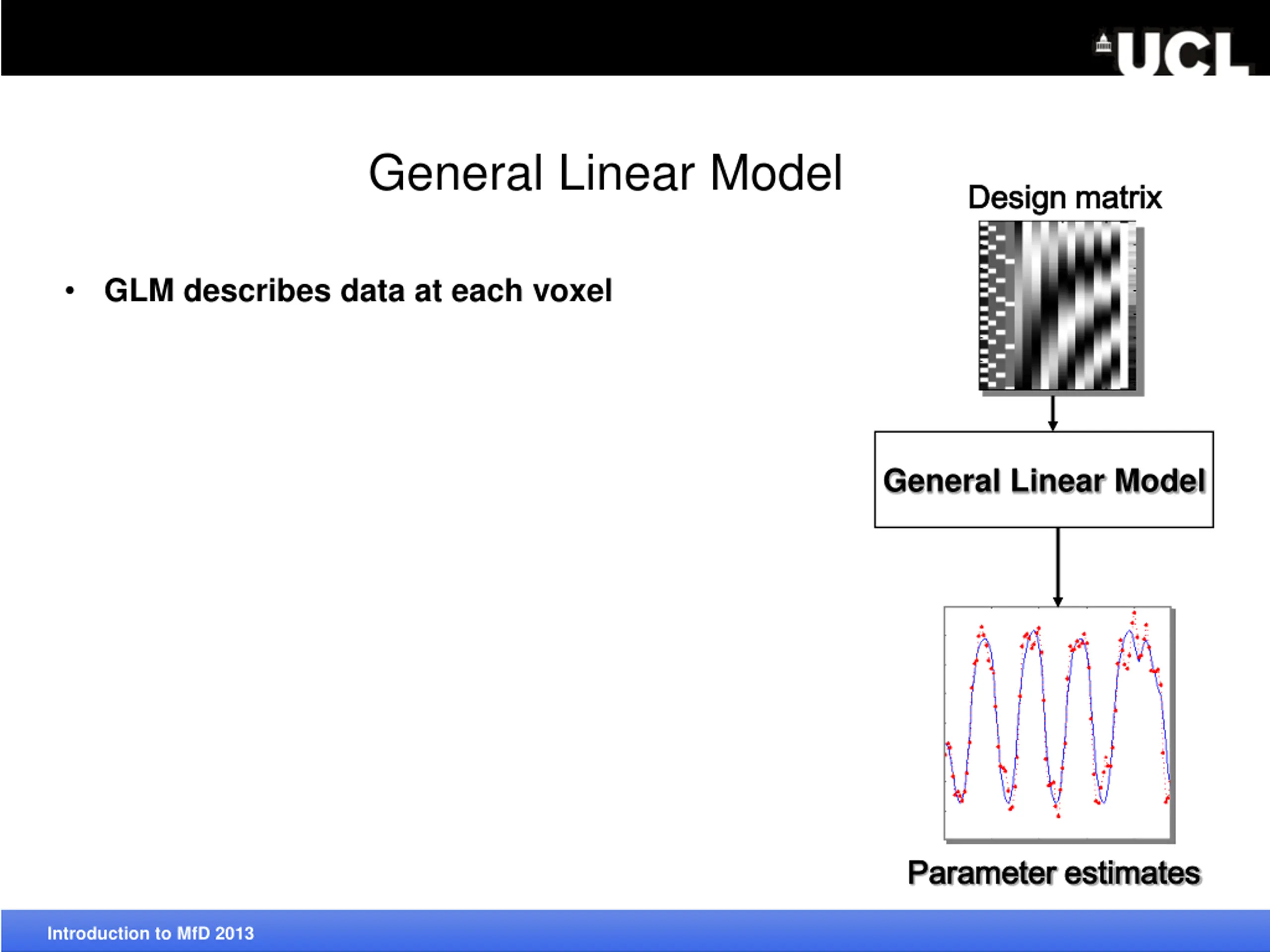 General Linear Model Design matrix Design matrix GLM describes data at each voxel General Linear Model Parameter estimates Parameter estimates Introduction to MfD 2013