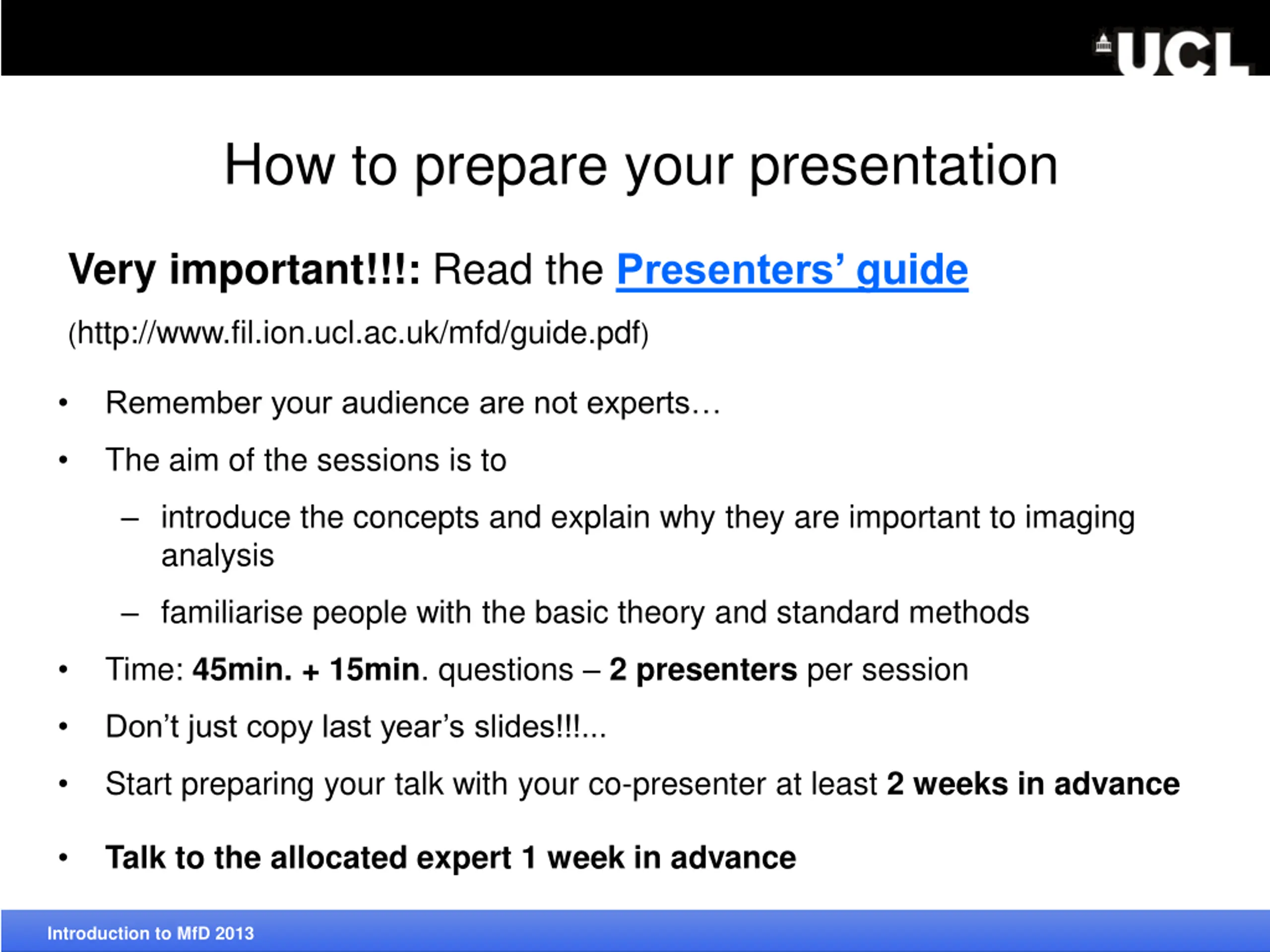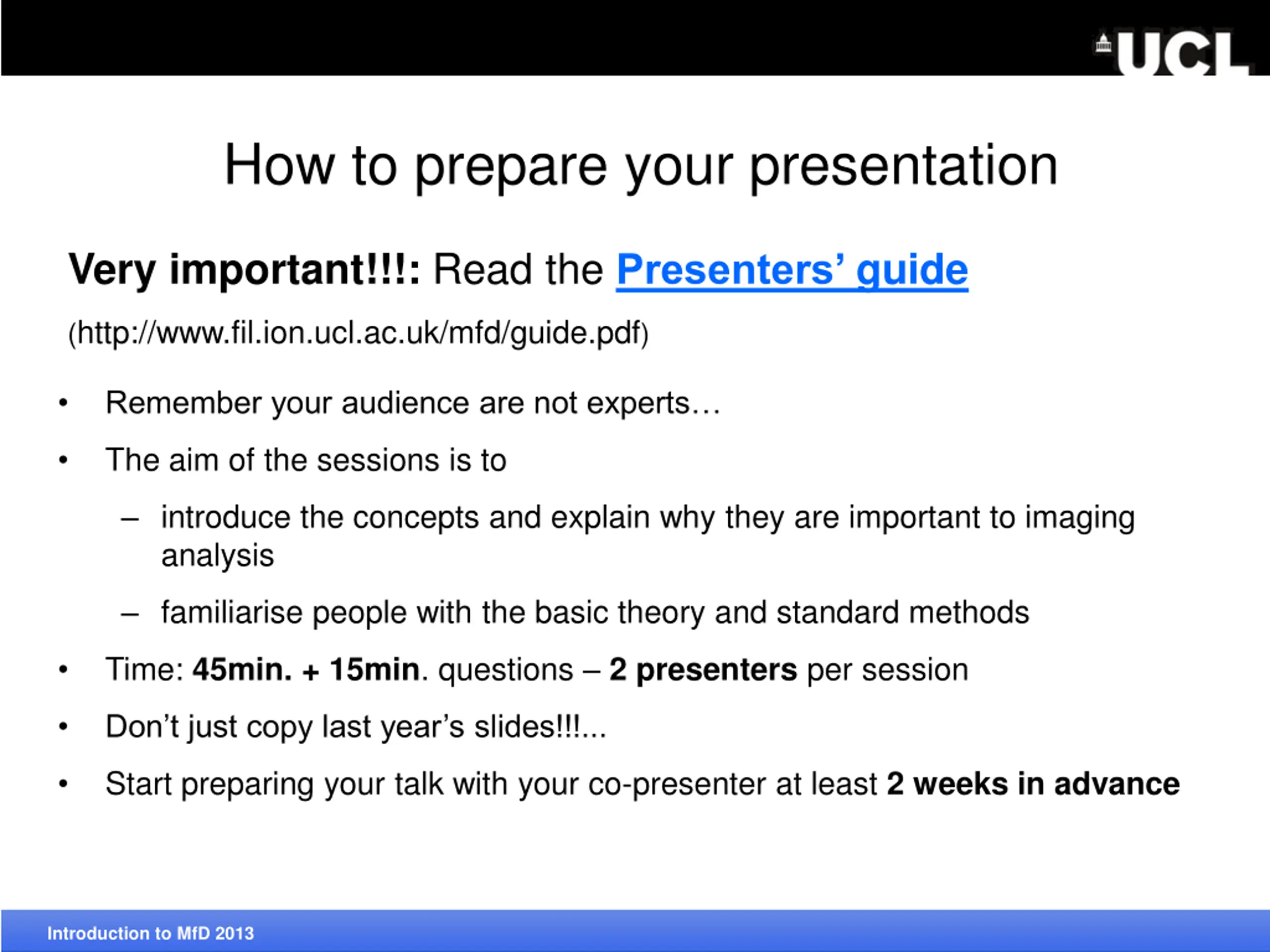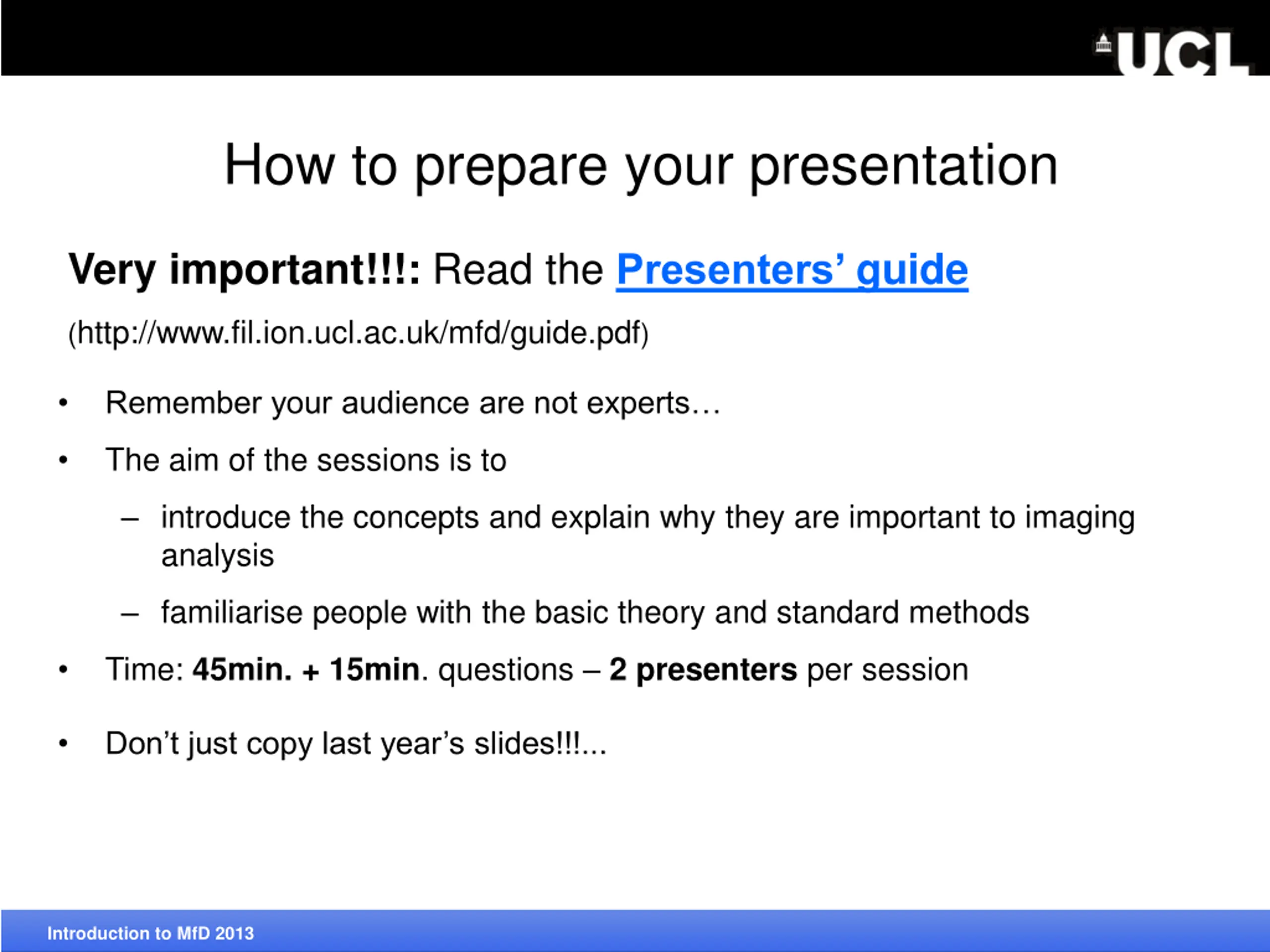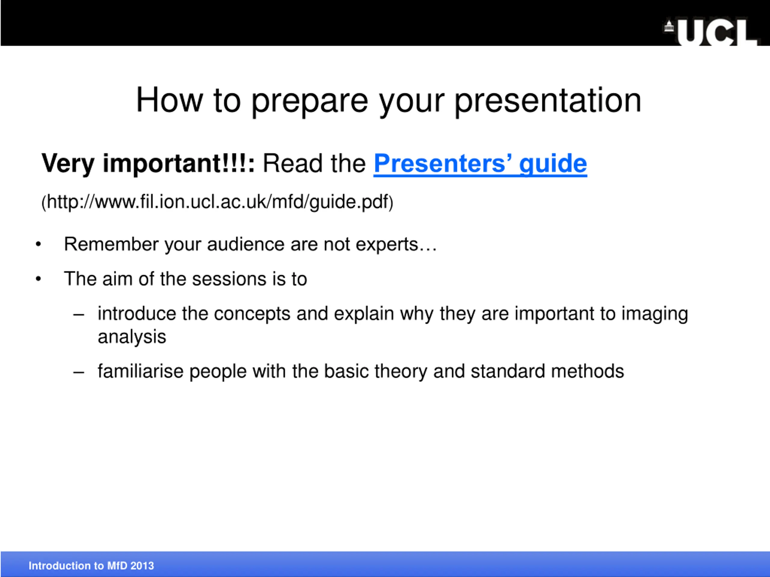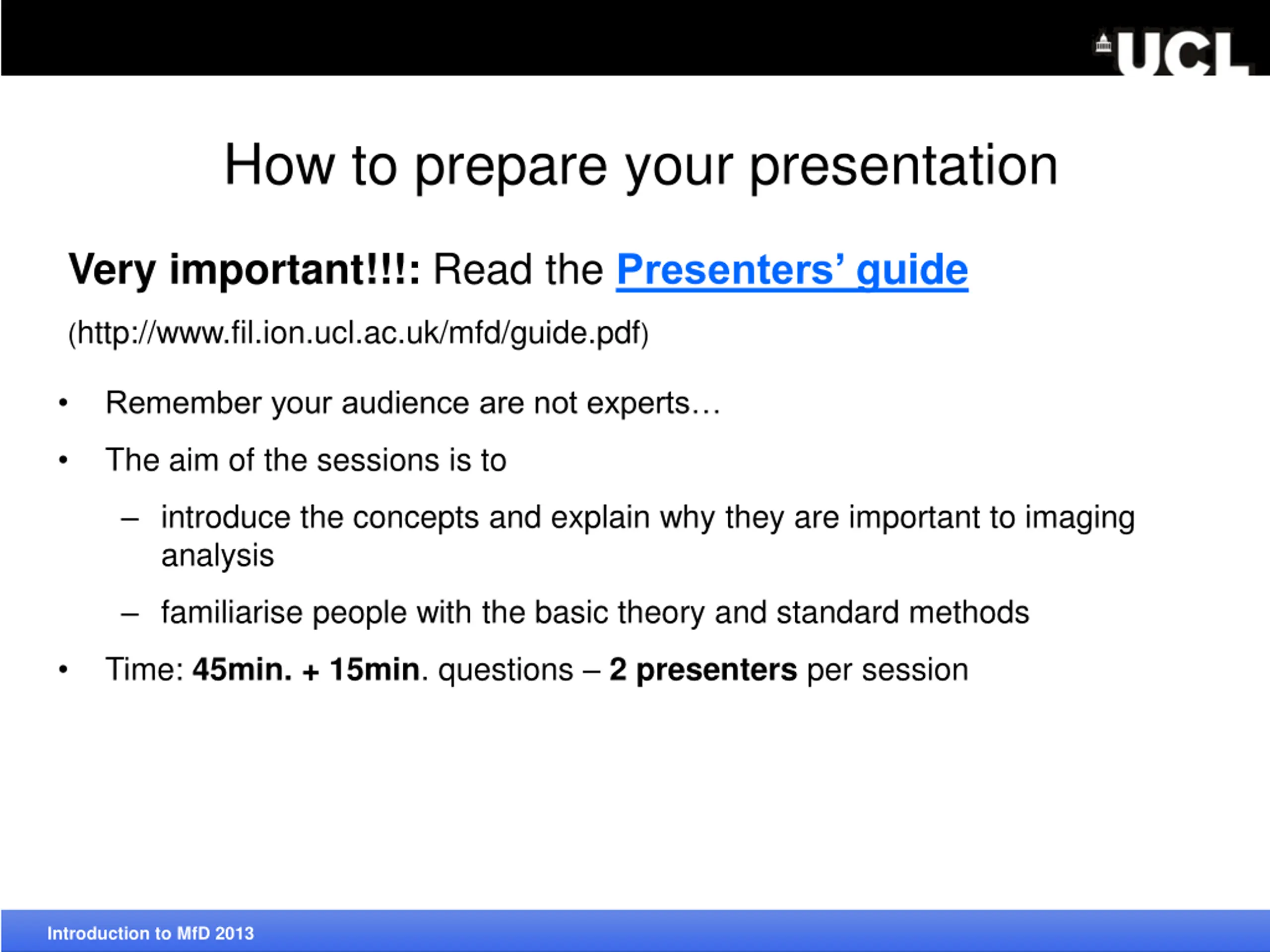 How to prepare your presentation Very important!!!: Read thePresenters guide (http://www.fil.ion.ucl.ac.uk/mfd/guide.pdf) Remember your audience are not experts The aim of the sessions is to introduce the concepts and explain why they are important to imaging analysis familiarise people with the basic theory and standard methods Introduction to MfD 2013