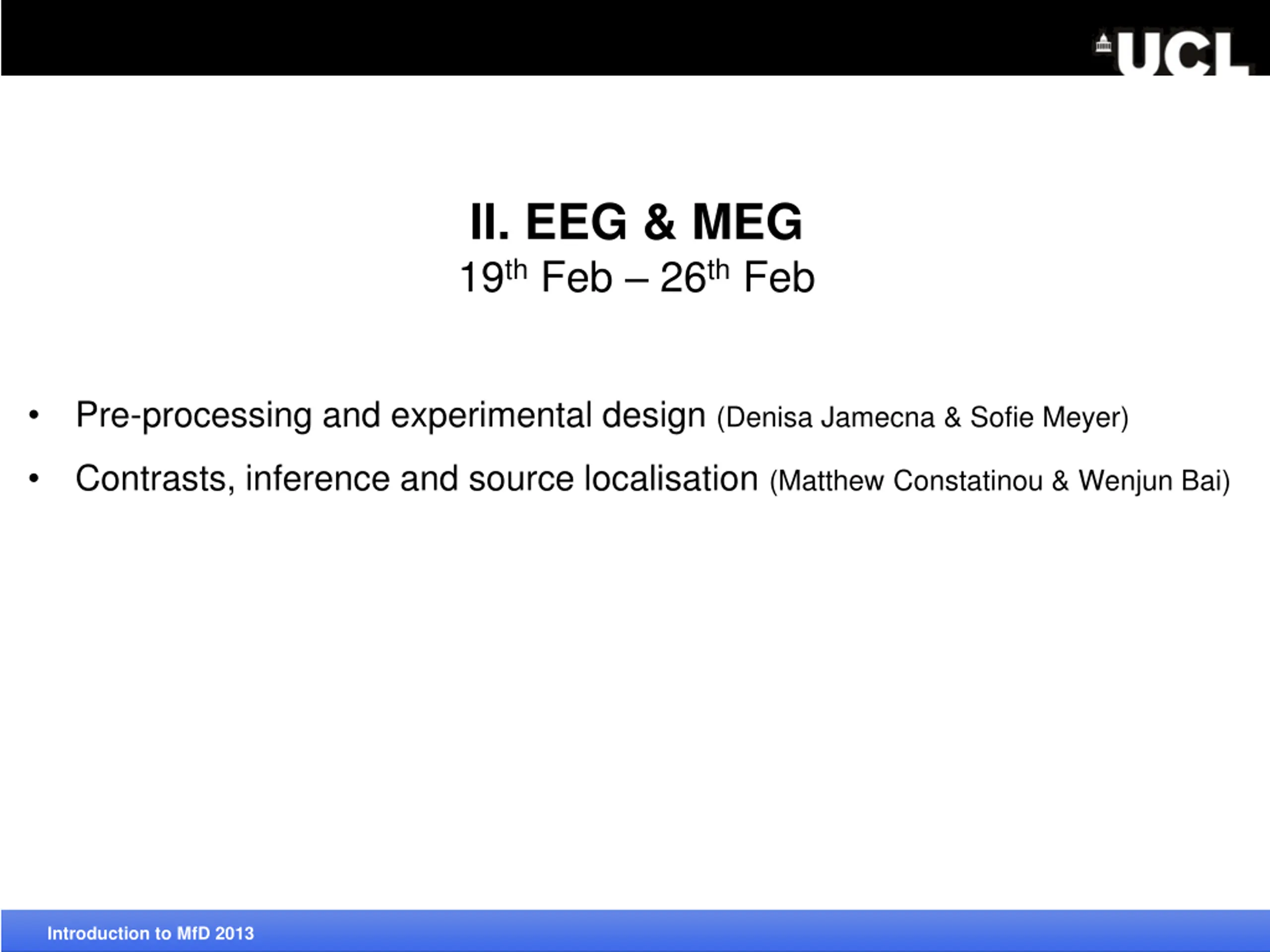 II. EEG & MEG 19th Feb 26th Feb Pre-processing and experimental design (Denisa Jamecna & Sofie Meyer) Contrasts, inference and source localisation (Matthew Constatinou & Wenjun Bai) Introduction to MfD 2013