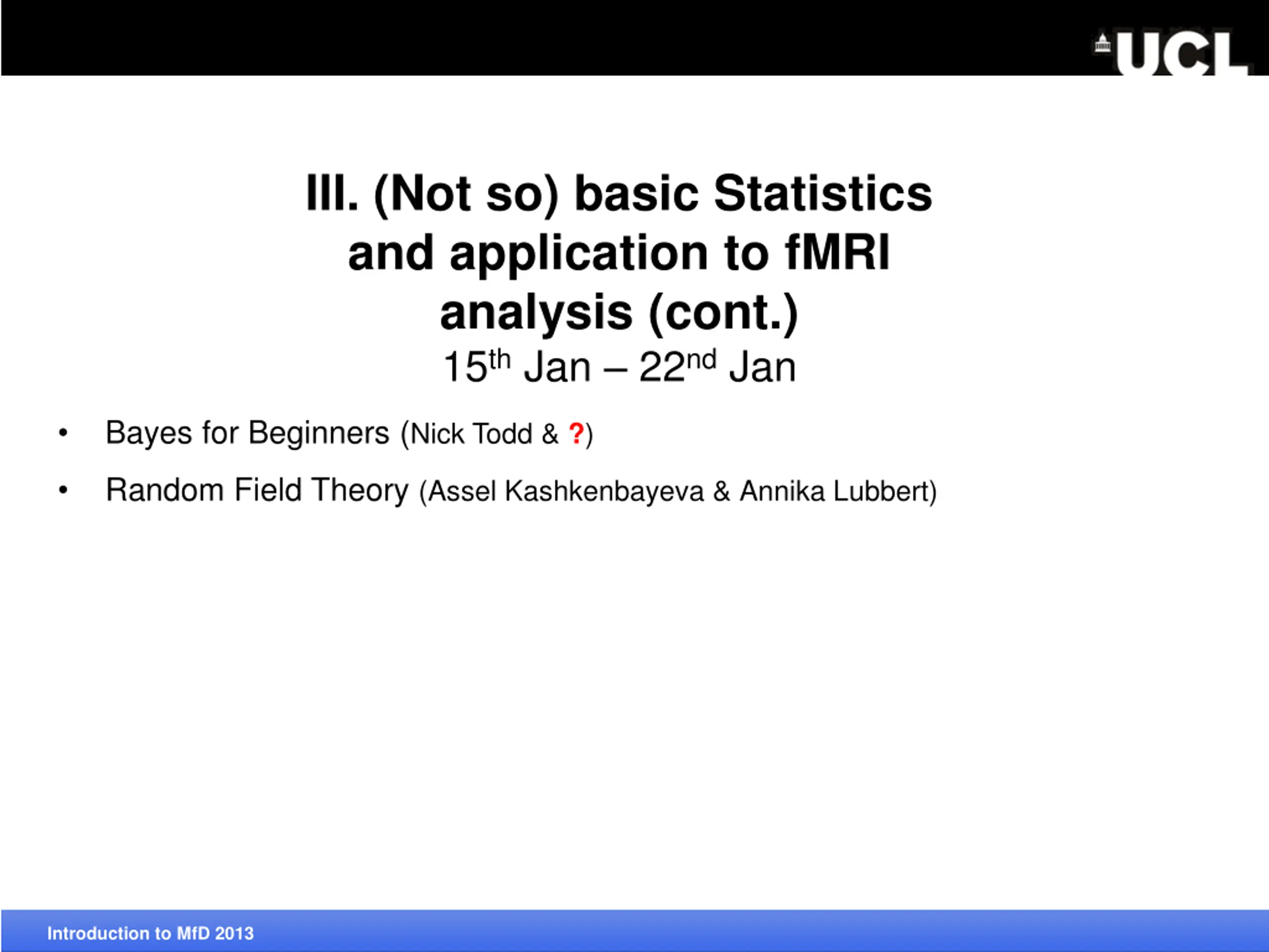 III. (Not so) basic Statistics and application to fMRI analysis (cont.) 15th Jan 22nd Jan Bayes for Beginners (Nick Todd & ?) Introduction to MfD 2013