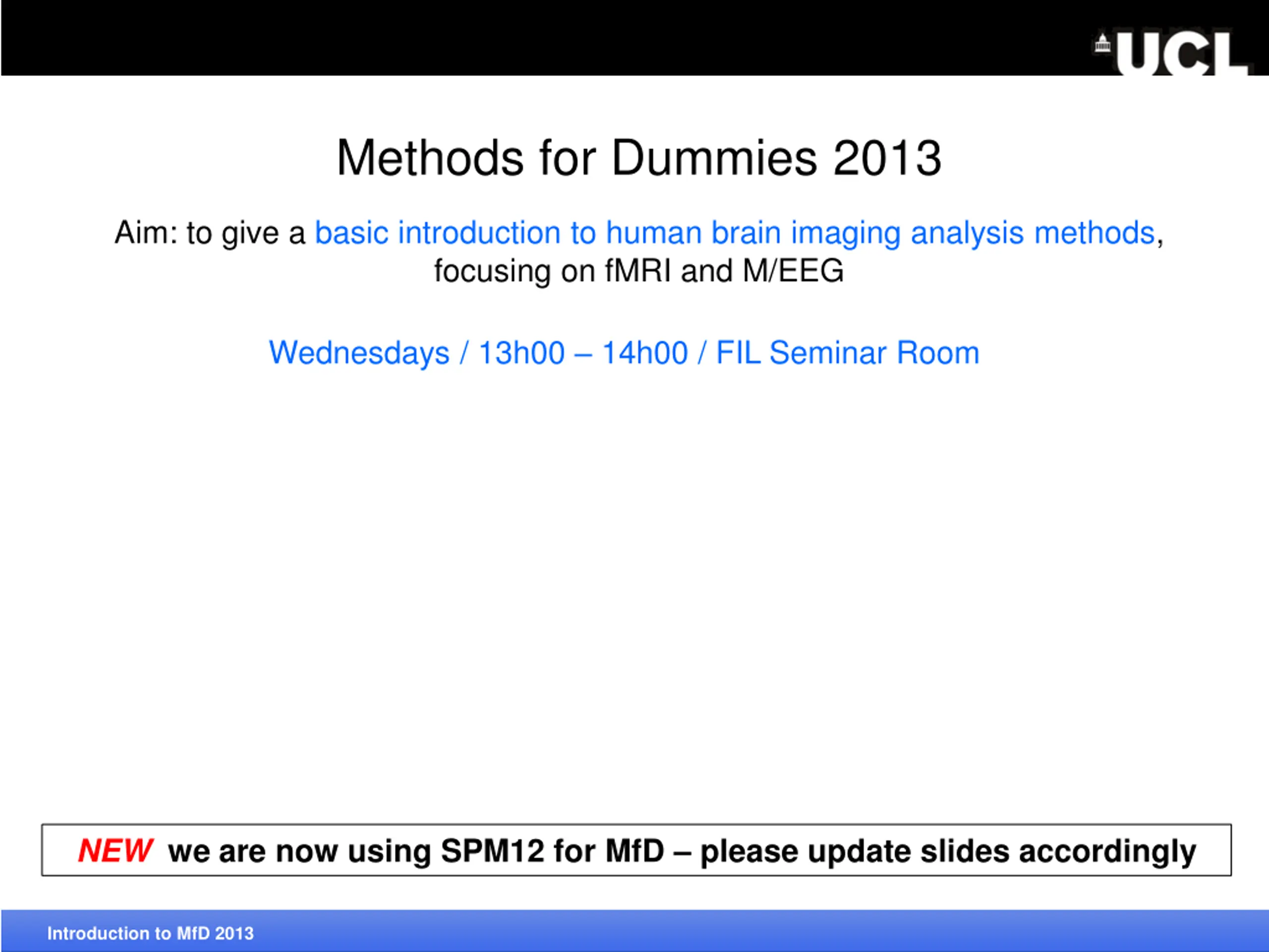 Methods for Dummies 2013 Aim: to give a basic introduction to human brain imaging analysis methods, focusing on fMRI and M/EEG Wednesdays / 13h00 14h00 / FIL Seminar Room NEW we are now using SPM12 for MfD please update slides accordingly Introduction to MfD 2013