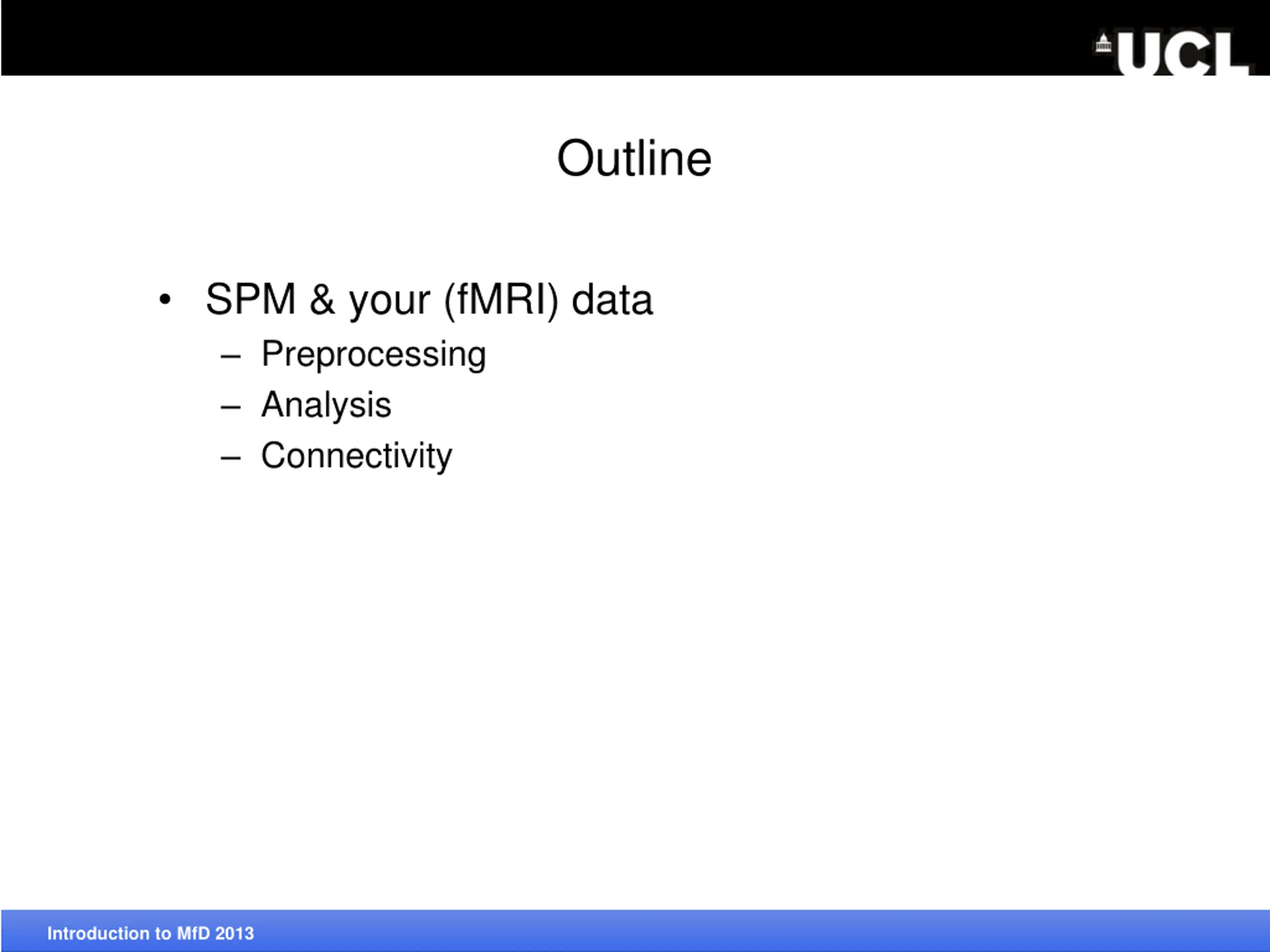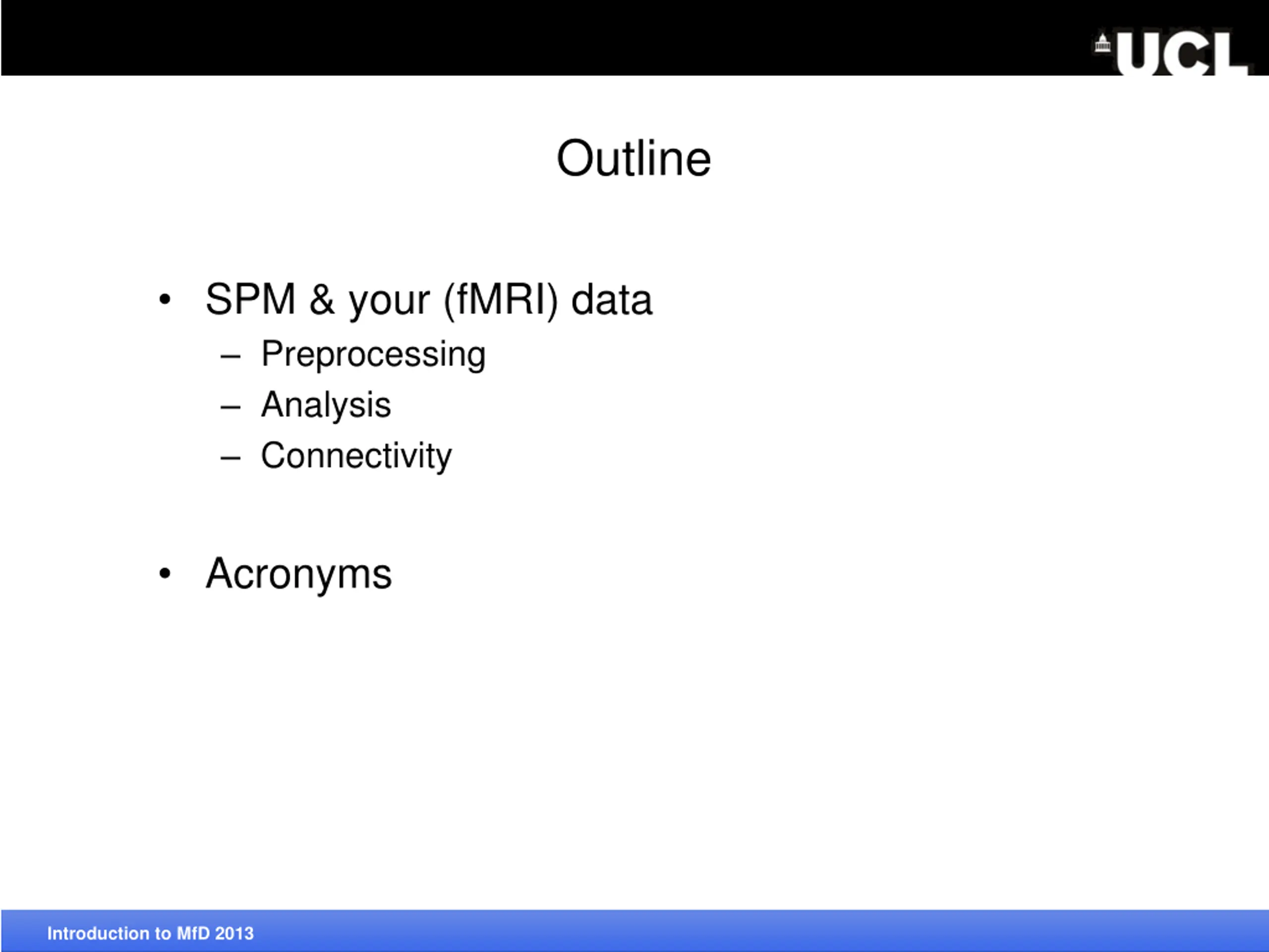 Outline SPM & your (fMRI) data Preprocessing Analysis Connectivity Acronyms Introduction to MfD 2013