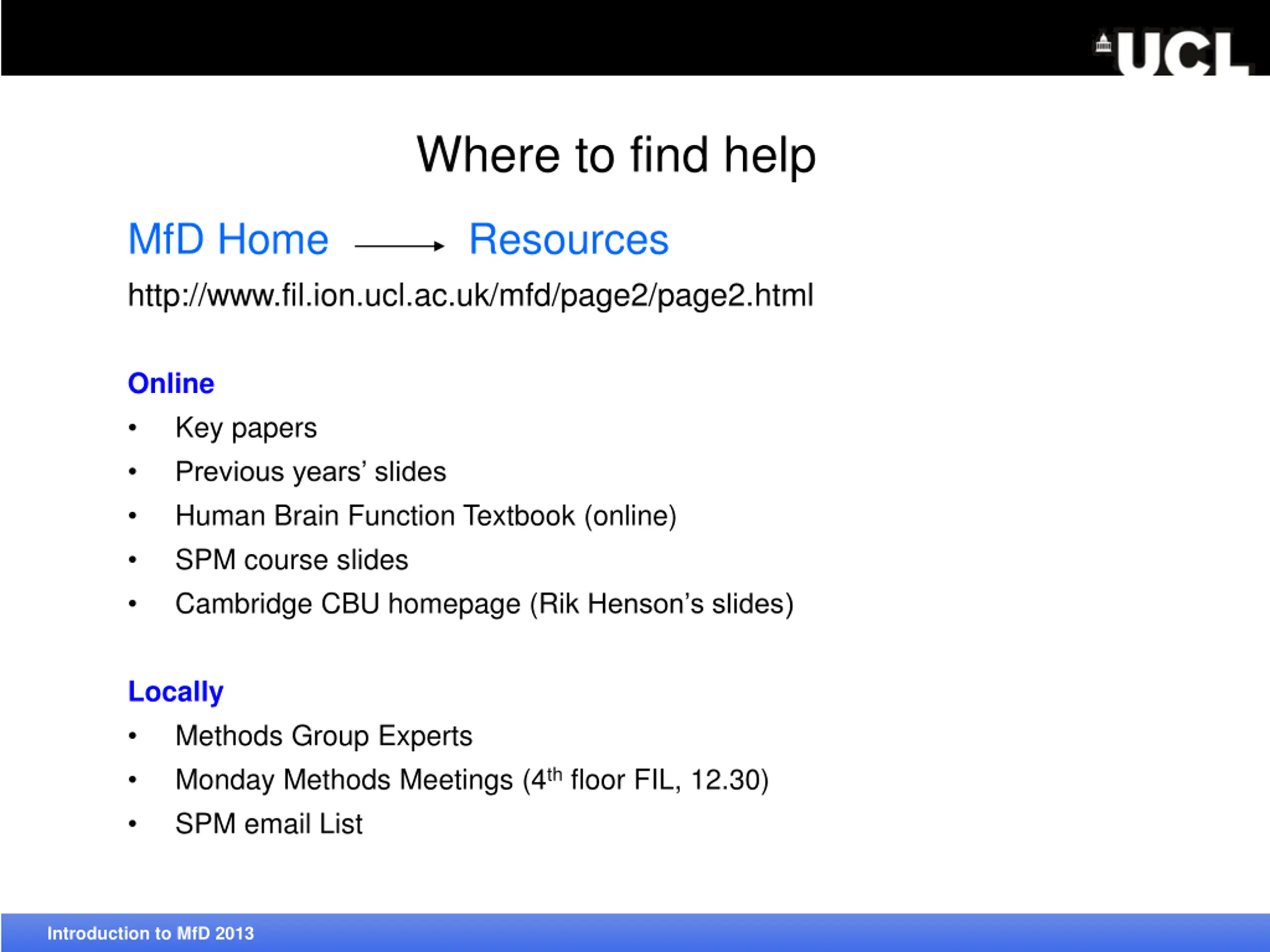 Where to find help MfD Home Resources http://www.fil.ion.ucl.ac.uk/mfd/page2/page2.html Online Key papers Previous years slides Human Brain Function Textbook (online) SPM course slides Cambridge CBU homepage (Rik Henson s slides) Introduction to MfD 2013