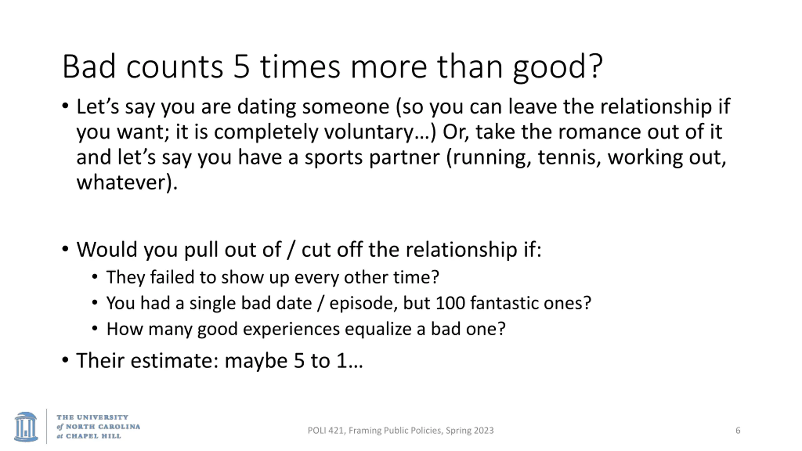 Bad counts 5 times more than good? Let s say you are dating someone (so you can leave the relationship if you want; it is completely voluntary ) Or, take the romance out of it and let s say you have a sports partner (running, tennis, working out, whatever). Would you pull out of / cut off the relationship if: They failed to show up every other time? You had a single bad date / episode, but 100 fantastic ones? How many good experiences equalize a bad one? Their estimate: maybe 5 to 1 POLI 421, Framing Public Policies, Spring 2023 6
