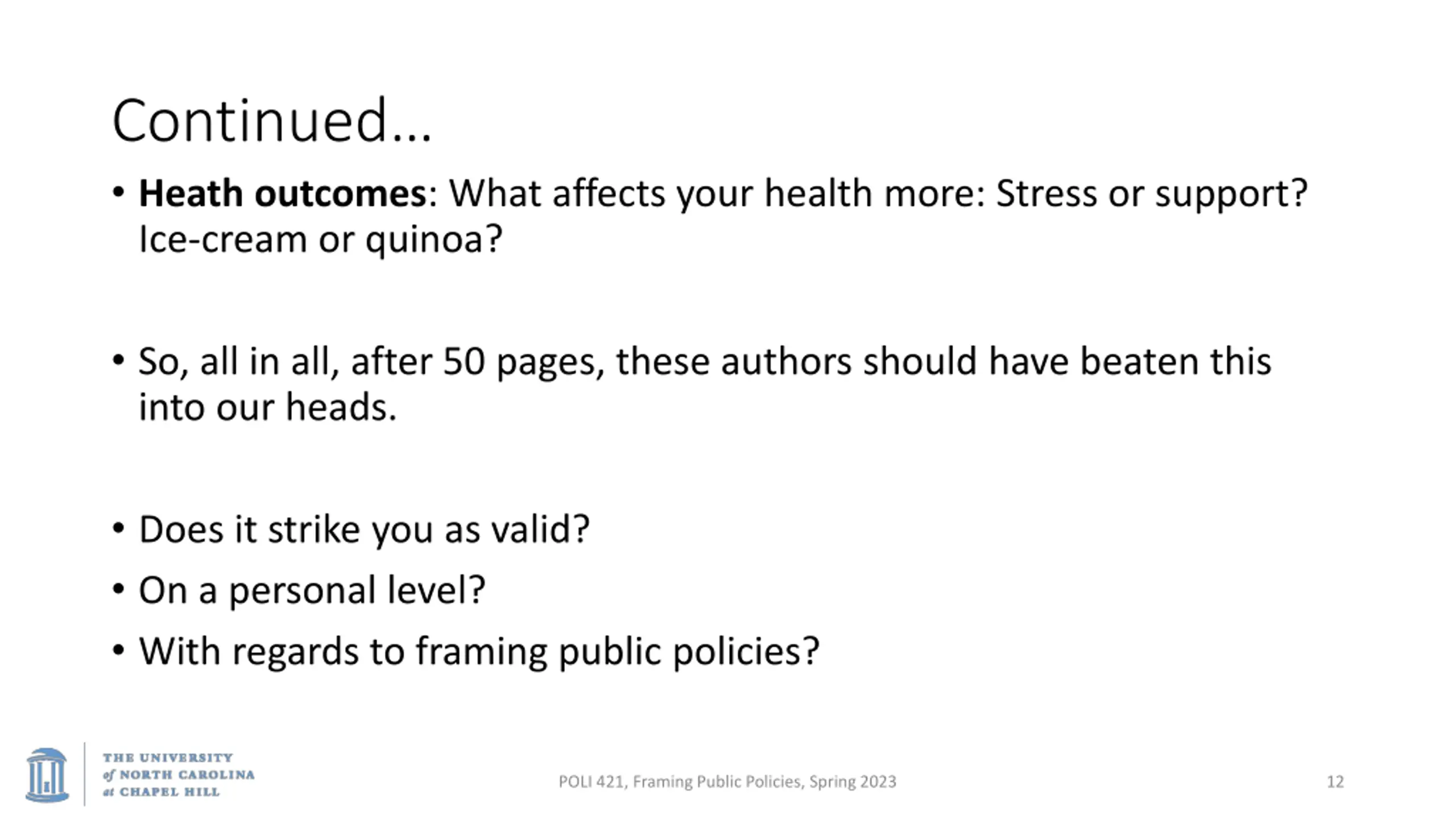 Continued Heath outcomes: What affects your health more: Stress or support? Ice-cream or quinoa? So, all in all, after 50 pages, these authors should have beaten this into our heads. Does it strike you as valid? On a personal level? With regards to framing public policies? POLI 421, Framing Public Policies, Spring 2023 12