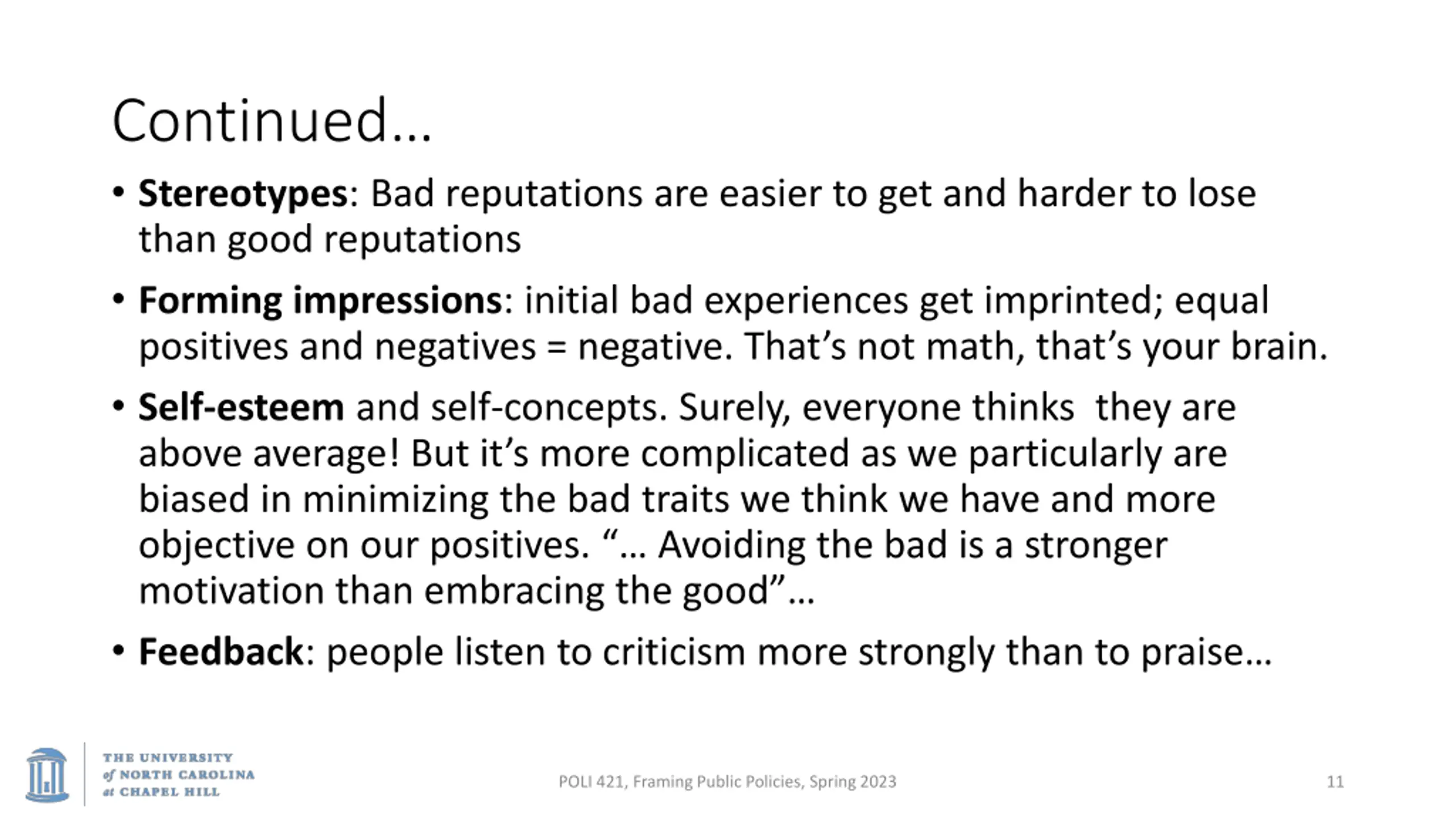 Continued Stereotypes: Bad reputations are easier to get and harder to lose than good reputations Forming impressions: initial bad experiences get imprinted; equal positives and negatives = negative. That s not math, that s your brain. Self-esteem and self-concepts. Surely, everyone thinks they are above average! But it s more complicated as we particularly are biased in minimizing the bad traits we think we have and more objective on our positives. Avoiding the bad is a stronger motivation than embracing the good Feedback: people listen to criticism more strongly than to praise POLI 421, Framing Public Policies, Spring 2023 11