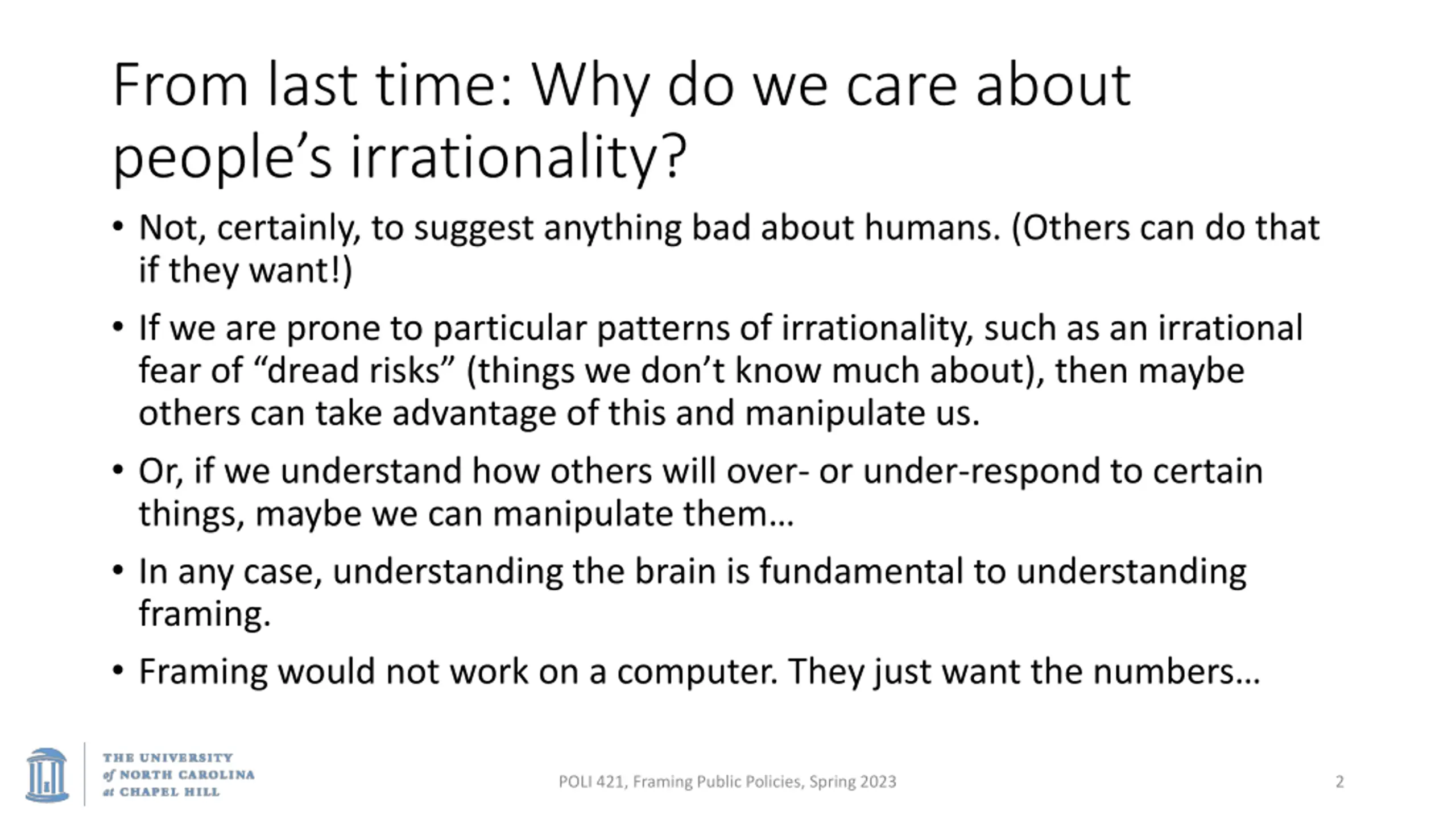 From last time: Why do we care about people s irrationality? Not, certainly, to suggest anything bad about humans. (Others can do that if they want!) If we are prone to particular patterns of irrationality, such as an irrational fear of dread risks (things we don t know much about), then maybe others can take advantage of this and manipulate us. Or, if we understand how others will over- or under-respond to certain things, maybe we can manipulate them In any case, understanding the brain is fundamental to understanding framing. Framing would not work on a computer. They just want the numbers POLI 421, Framing Public Policies, Spring 2023 2