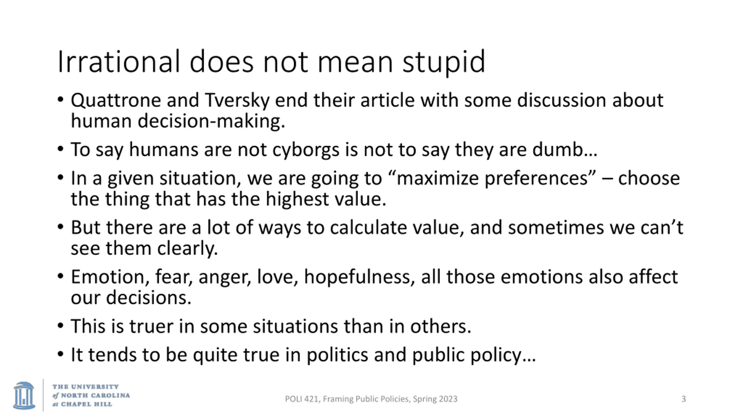 Irrational does not mean stupid Quattrone and Tversky end their article with some discussion about human decision-making. To say humans are not cyborgs is not to say they are dumb In a given situation, we are going to maximize preferences choose the thing that has the highest value. But there are a lot of ways to calculate value, and sometimes we can t see them clearly. Emotion, fear, anger, love, hopefulness, all those emotions also affect our decisions. This is truer in some situations than in others. It tends to be quite true in politics and public policy POLI 421, Framing Public Policies, Spring 2023 3