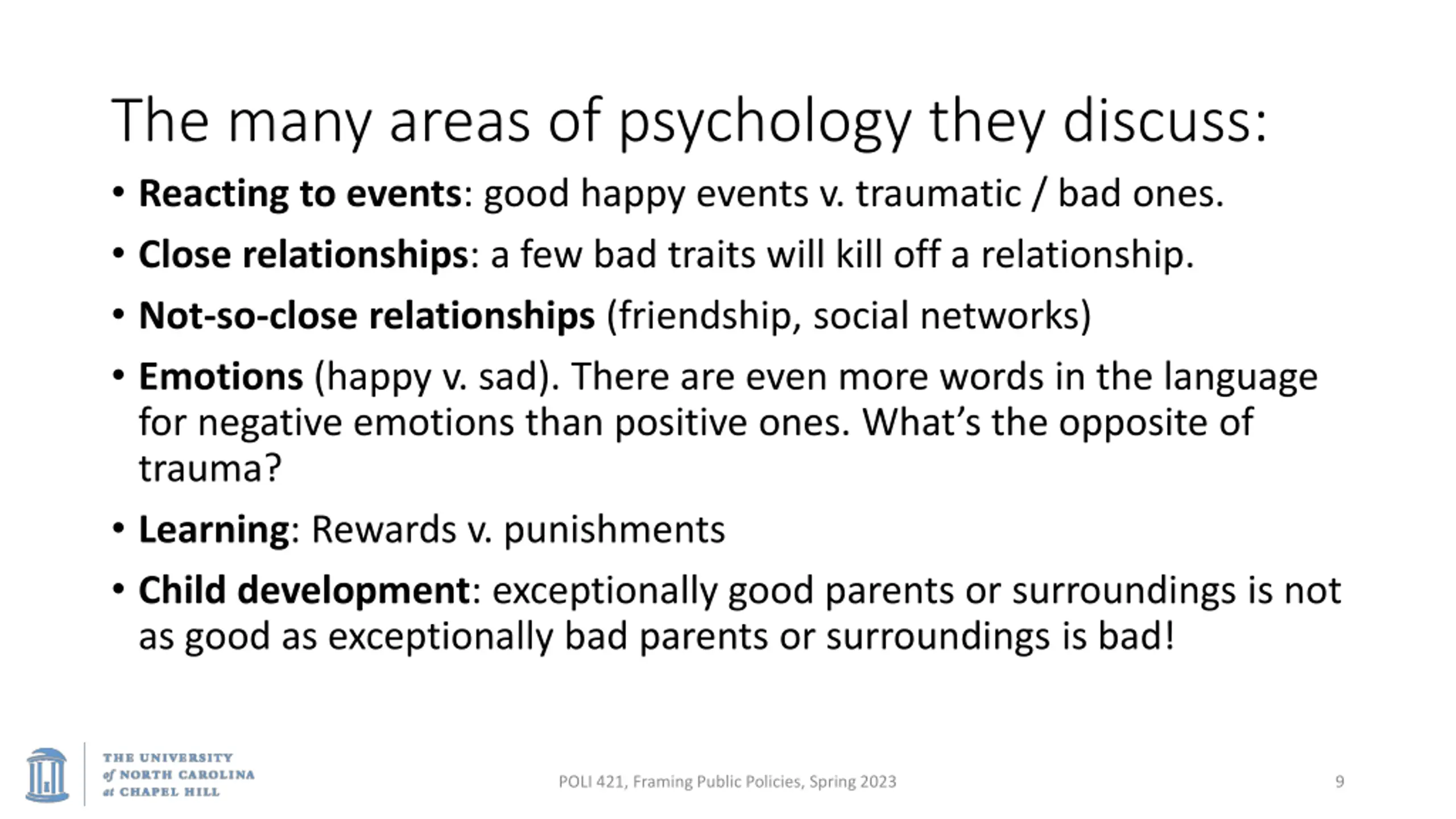 The many areas of psychology they discuss: Reacting to events: good happy events v. traumatic / bad ones. Close relationships: a few bad traits will kill off a relationship. Not-so-close relationships (friendship, social networks) Emotions (happy v. sad). There are even more words in the language for negative emotions than positive ones. What s the opposite of trauma? Learning: Rewards v. punishments Child development: exceptionally good parents or surroundings is not as good as exceptionally bad parents or surroundings is bad! POLI 421, Framing Public Policies, Spring 2023 9