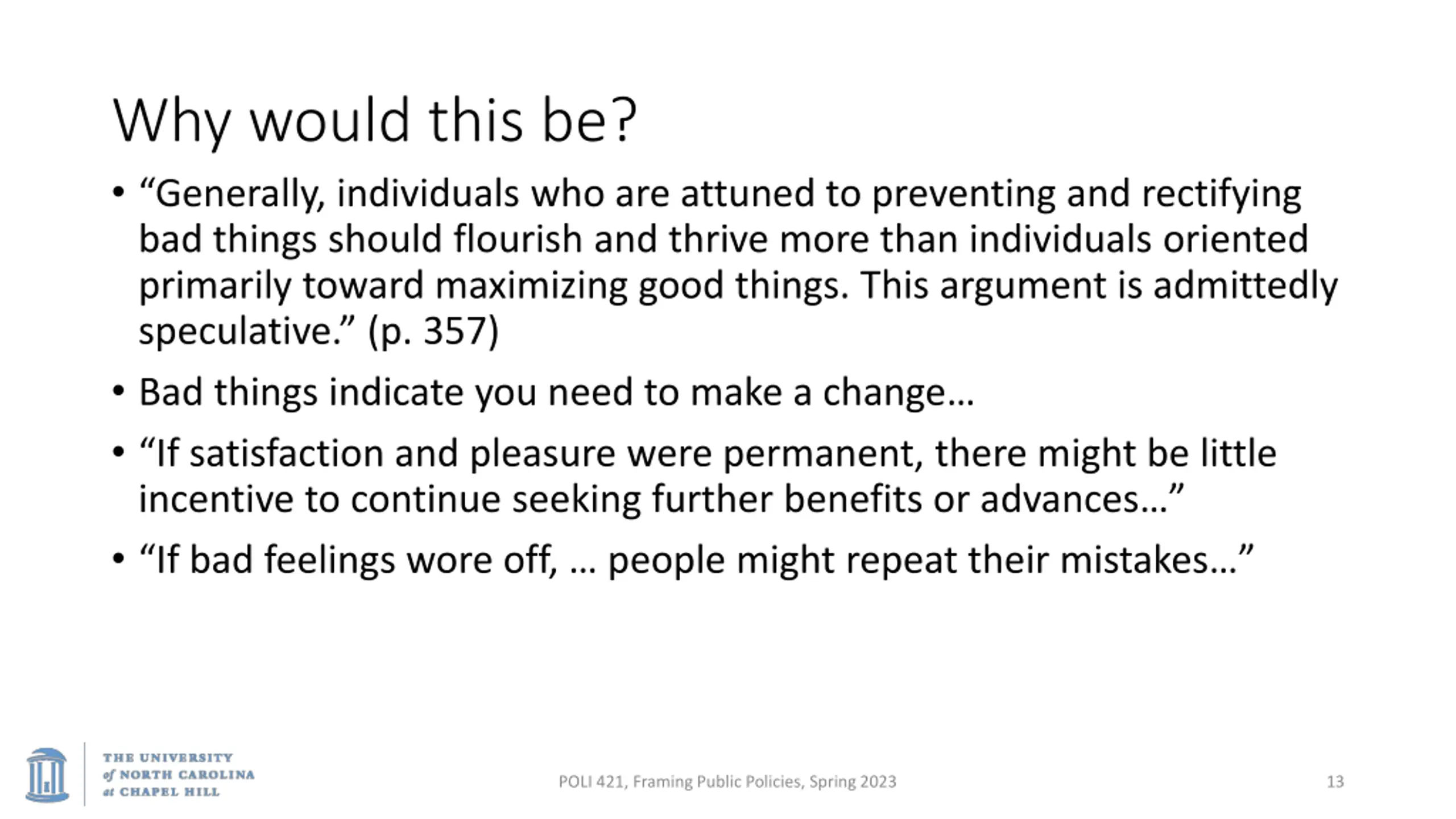 Why would this be? Generally, individuals who are attuned to preventing and rectifying bad things should flourish and thrive more than individuals oriented primarily toward maximizing good things. This argument is admittedly speculative. (p. 357) Bad things indicate you need to make a change If satisfaction and pleasure were permanent, there might be little incentive to continue seeking further benefits or advances If bad feelings wore off, people might repeat their mistakes POLI 421, Framing Public Policies, Spring 2023 13