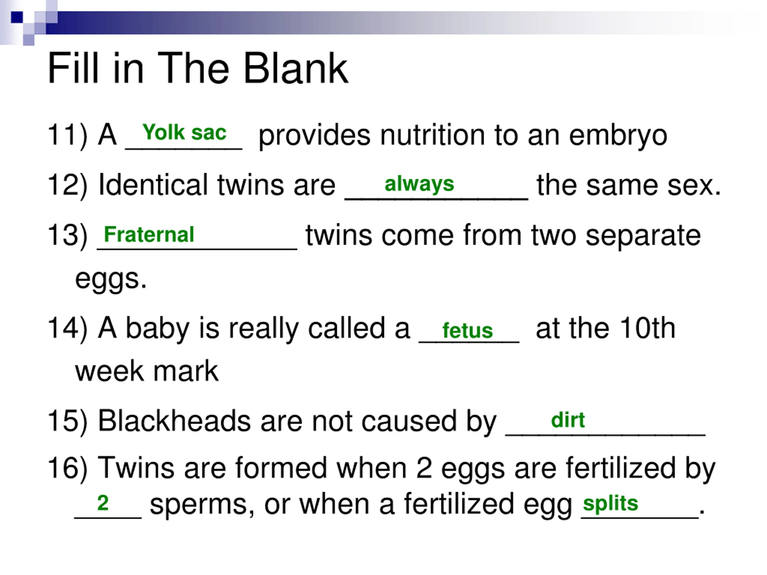 Fill in The Blank 11) A _______ provides nutrition to an embryo Yolk sac 12) Identical twins are ___________ the same sex. 13) ____________ twins come from two separate eggs. always Fraternal 14) A baby is really called a ______ at the 10th week mark fetus 15) Blackheads are not caused by ____________ 16) Twins are formed when 2 eggs are fertilized by ____ sperms, or when a fertilized egg _______. 2 dirt splits