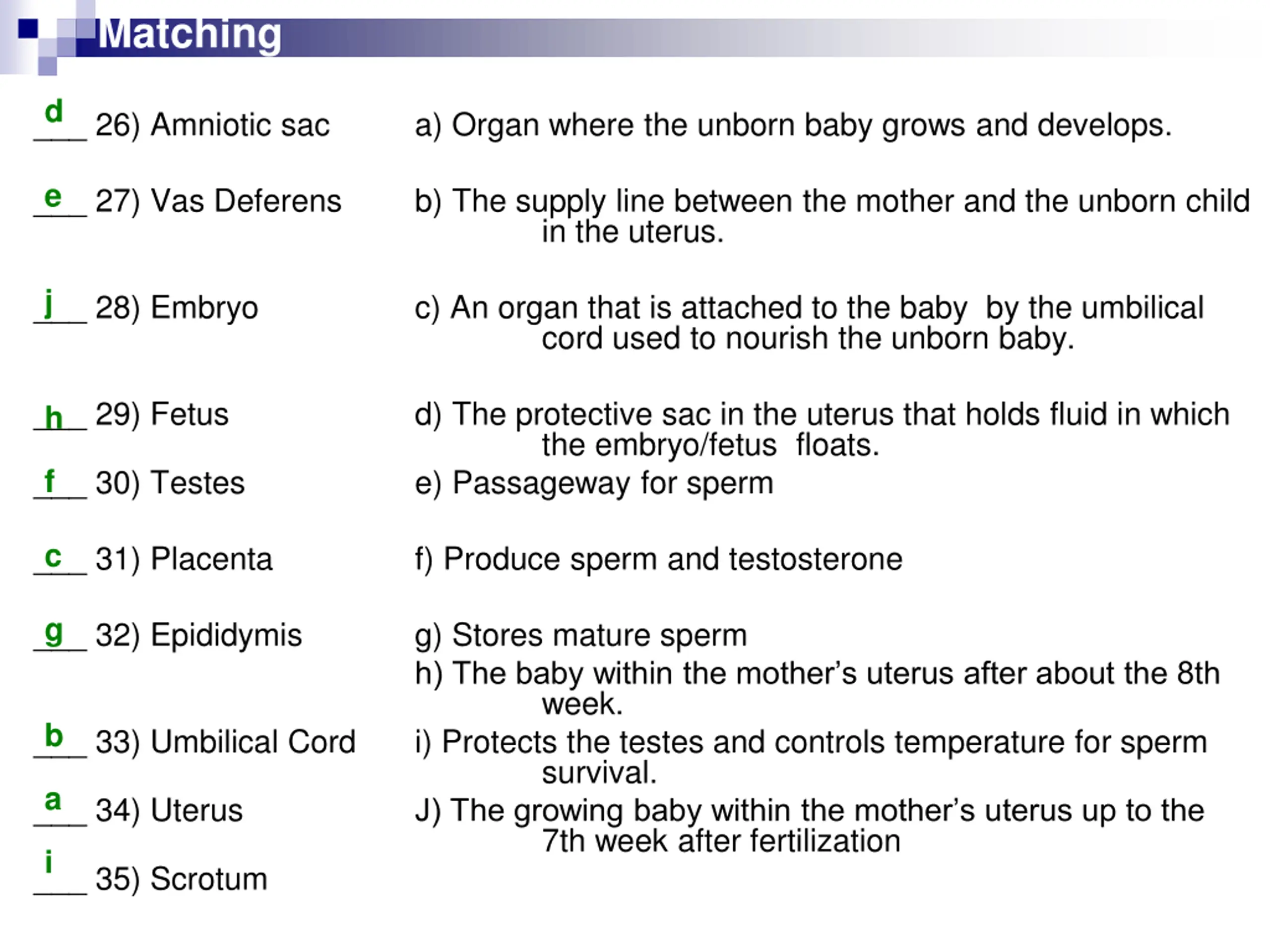 Matching d ___ 26) Amniotic sac a) Organ where the unborn baby grows and develops. e ___ 27) Vas Deferens b) The supply line between the mother and the unborn child in the uterus. j ___ 28) Embryo c) An organ that is attached to the baby by the umbilical cord used to nourish the unborn baby. ___ 29) Fetus h d) The protective sac in the uterus that holds fluid in which the embryo/fetus floats. e) Passageway for sperm ___ 30) Testes f ___ 31) Placenta c f) Produce sperm and testosterone g ___ 32) Epididymis ___ 33) Umbilical Cord ___ 34) Uterus ___ 35) Scrotum g) Stores mature sperm h) The baby within the mother s uterus after about the 8th week. i) Protects the testes and controls temperature for sperm survival. J) The growing baby within the mother s uterus up to the 7th week after fertilization b a i