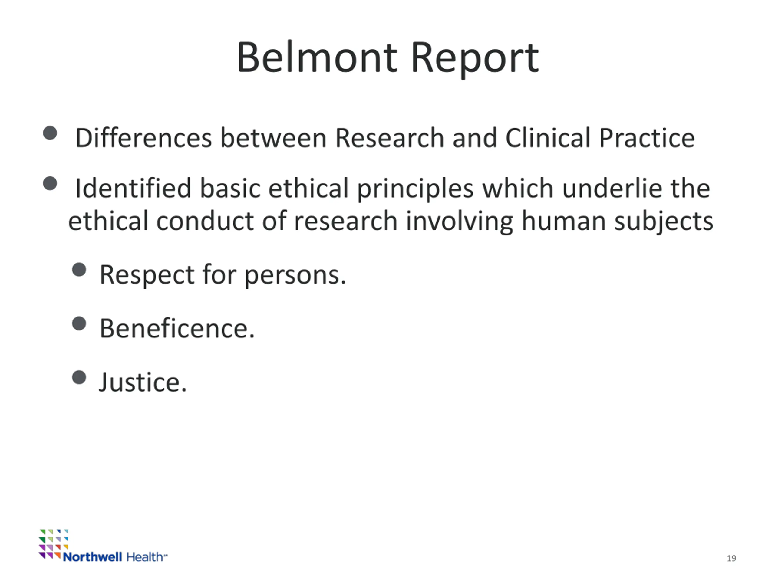 Belmont Report Differences between Research and Clinical Practice Identified basic ethical principles which underlie the ethical conduct of research involving human subjects Respect for persons. Beneficence. Justice. 19