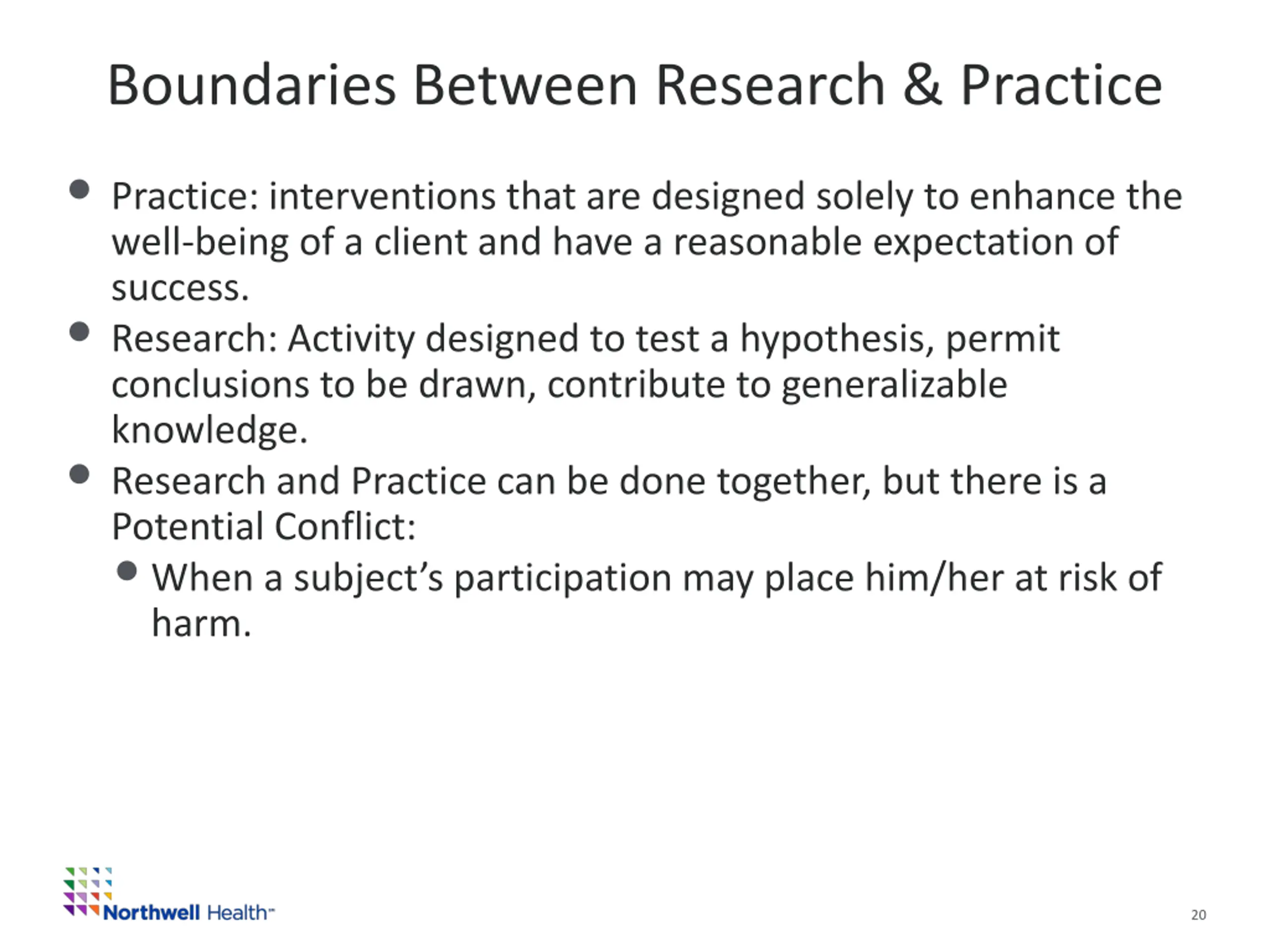 Boundaries Between Research & Practice Practice: interventions that are designed solely to enhance the well-being of a client and have a reasonable expectation of success. Research: Activity designed to test a hypothesis, permit conclusions to be drawn, contribute to generalizable knowledge. Research and Practice can be done together, but there is a Potential Conflict: When a subject s participation may place him/her at risk of harm. 20