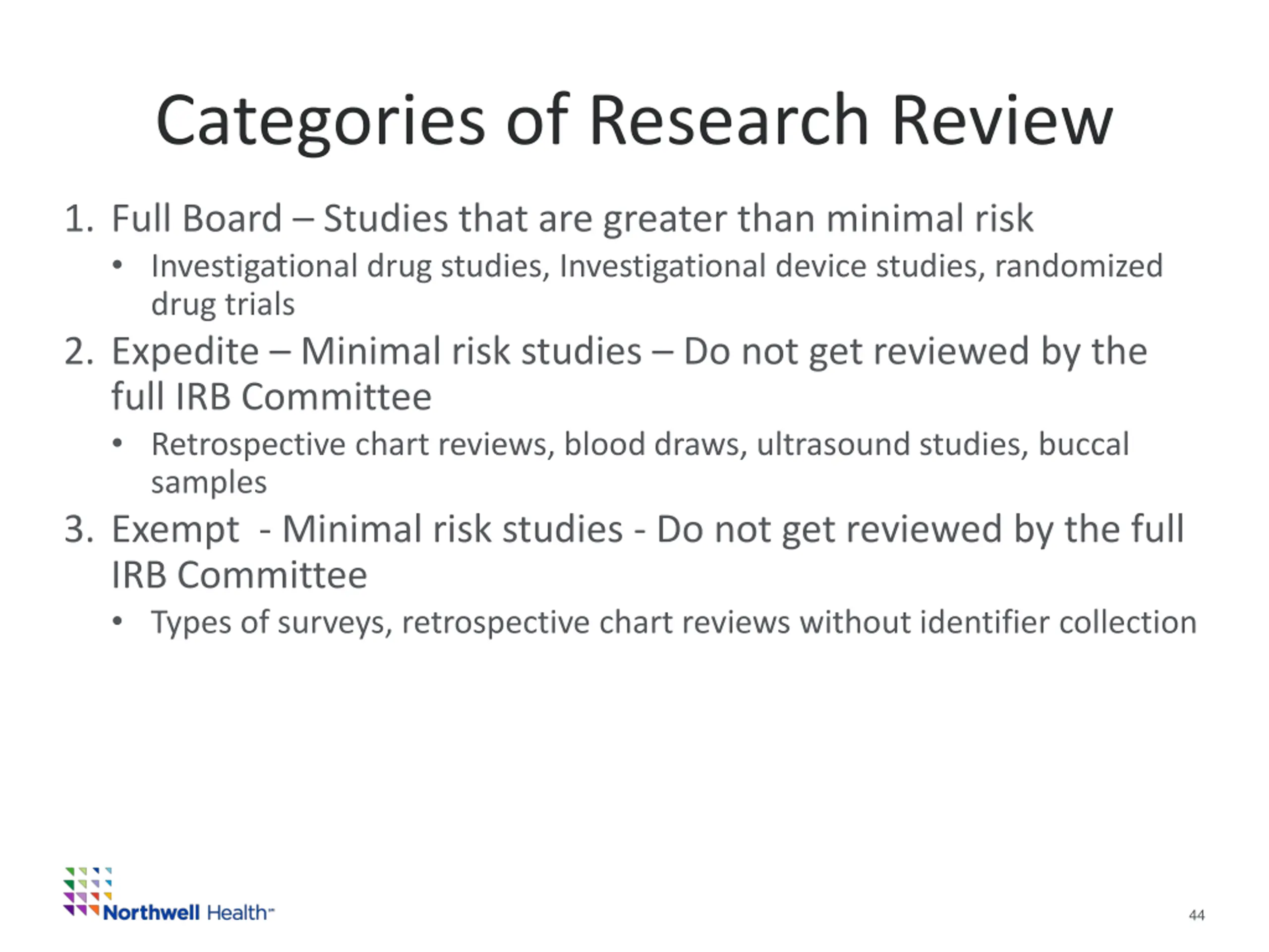 Categories of Research Review 1. Full Board Studies that are greater than minimal risk Investigational drug studies, Investigational device studies, randomized drug trials 2. Expedite Minimal risk studies Do not get reviewed by the full IRB Committee Retrospective chart reviews, blood draws, ultrasound studies, buccal samples 3. Exempt - Minimal risk studies - Do not get reviewed by the full IRB Committee Types of surveys, retrospective chart reviews without identifier collection 44