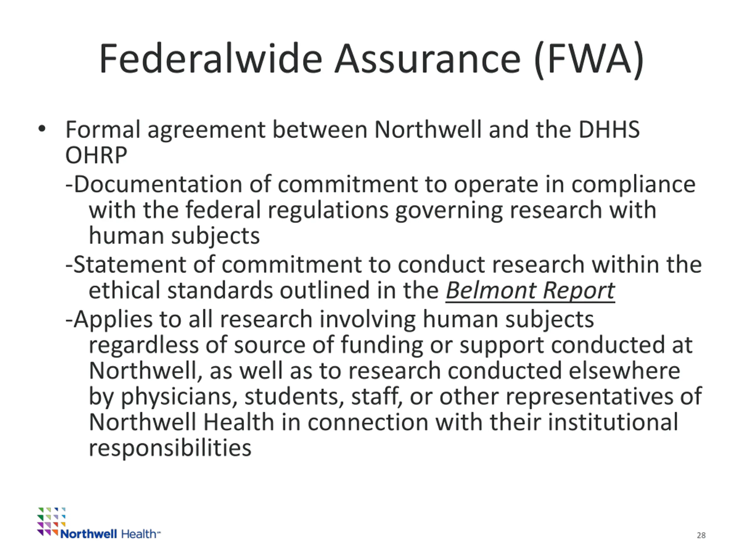 Federalwide Assurance (FWA) Formal agreement between Northwell and the DHHS OHRP -Documentation of commitment to operate in compliance with the federal regulations governing research with human subjects -Statement of commitment to conduct research within the ethical standards outlined in the Belmont Report -Applies to all research involving human subjects regardless of source of funding or support conducted at Northwell, as well as to research conducted elsewhere by physicians, students, staff, or other representatives of Northwell Health in connection with their institutional responsibilities 28
