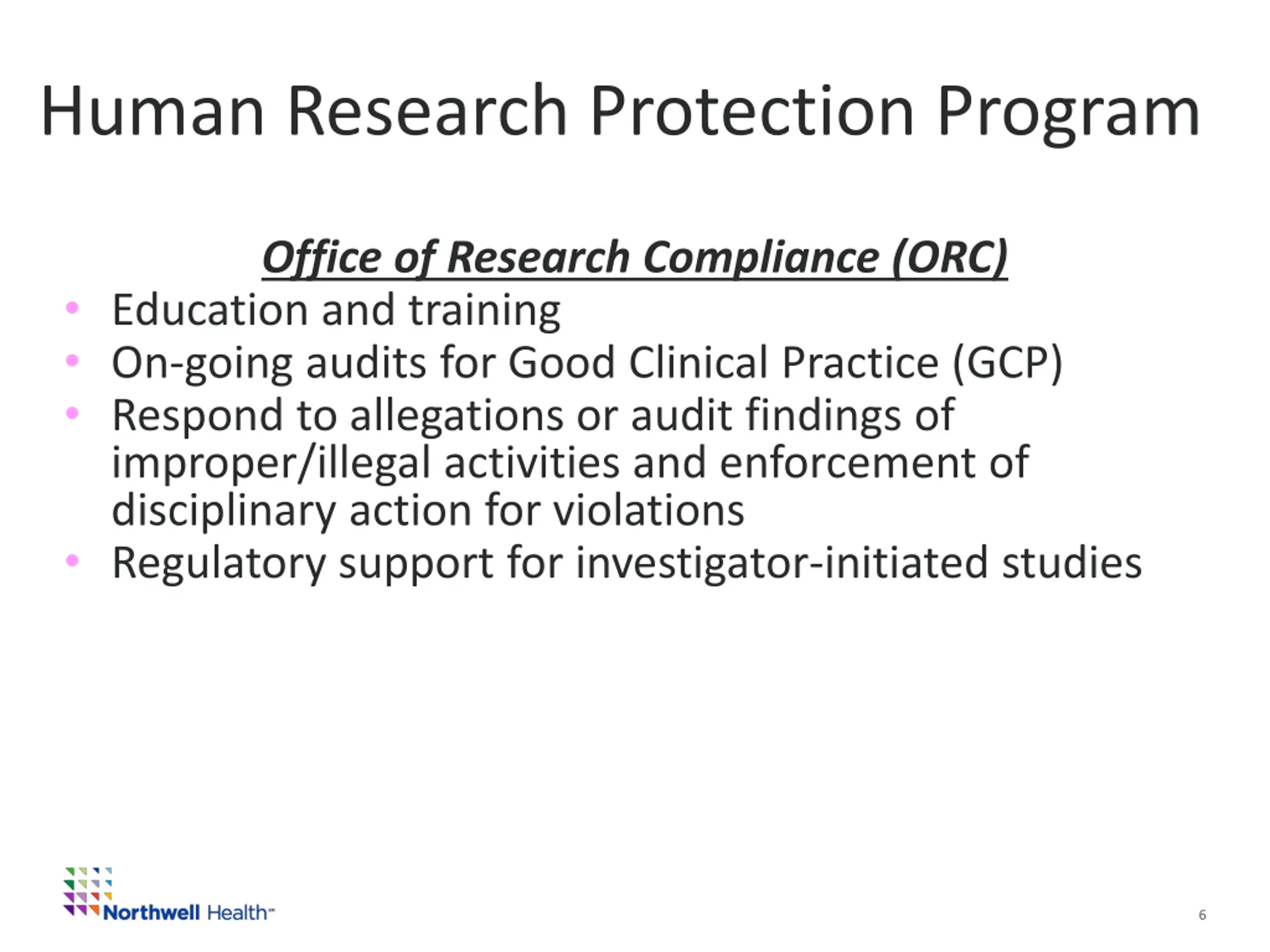 Human Research Protection Program Office of Research Compliance (ORC) Office of the Human Research Protection Program (HRPP) The ORC and HRPP work together to protect the rights, welfare and privacy of research participants 5