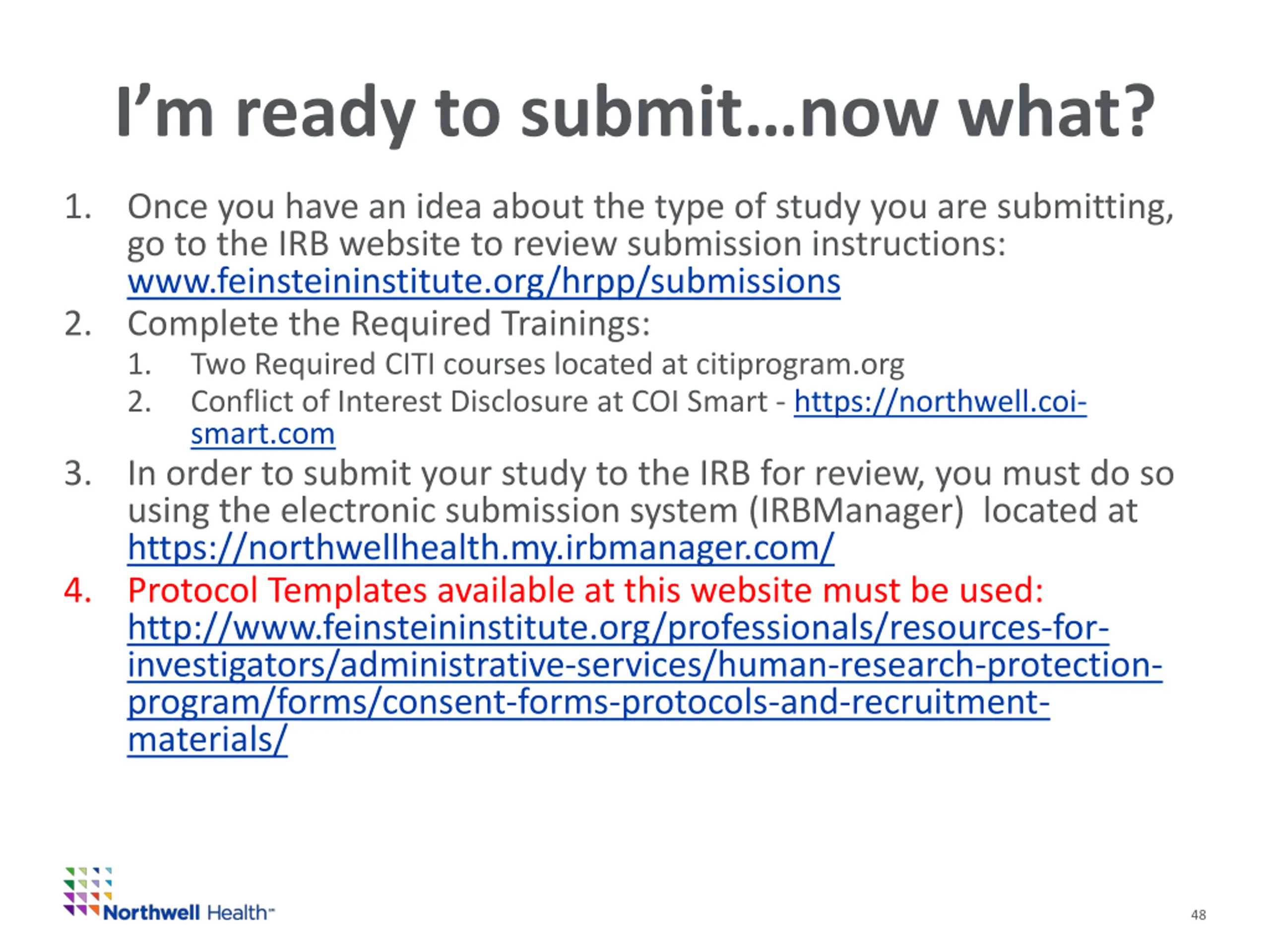 Im ready to submitnow what? 1. Once you have an idea about the type of study you are submitting, go to the IRB website to review submission instructions: www.feinsteininstitute.org/hrpp/submissions 2. Complete the Required Trainings: 1. Two Required CITI courses located at citiprogram.org 2. Conflict of Interest Disclosure at COI Smart - https://northwell.coi- smart.com 3. In order to submit your study to the IRB for review, you must do so using the electronic submission system (IRBManager) located at https://northwellhealth.my.irbmanager.com/ 4. Protocol Templates available at this website must be used: http://www.feinsteininstitute.org/professionals/resources-for- investigators/administrative-services/human-research-protection- program/forms/consent-forms-protocols-and-recruitment- materials/ 48