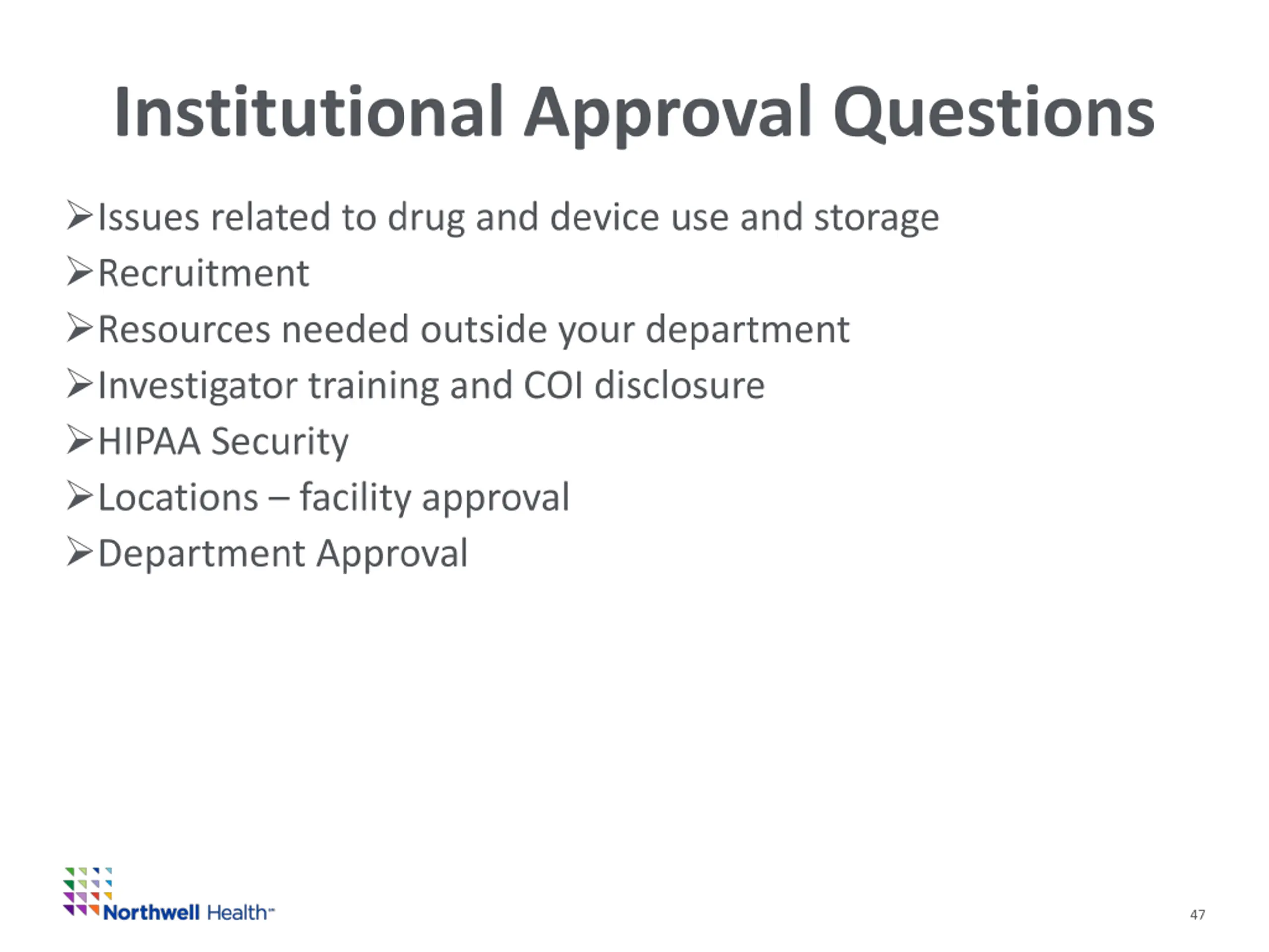 Institutional Approval IRB Approval The study has been evaluated and a decision has been made that the investigator has the resources, expertise and regulatory approvals necessary to conduct the study successfully. ( IRB approval is part of the institutional approval process) Study has been reviewed and meets criteria of an ethical study design. 46