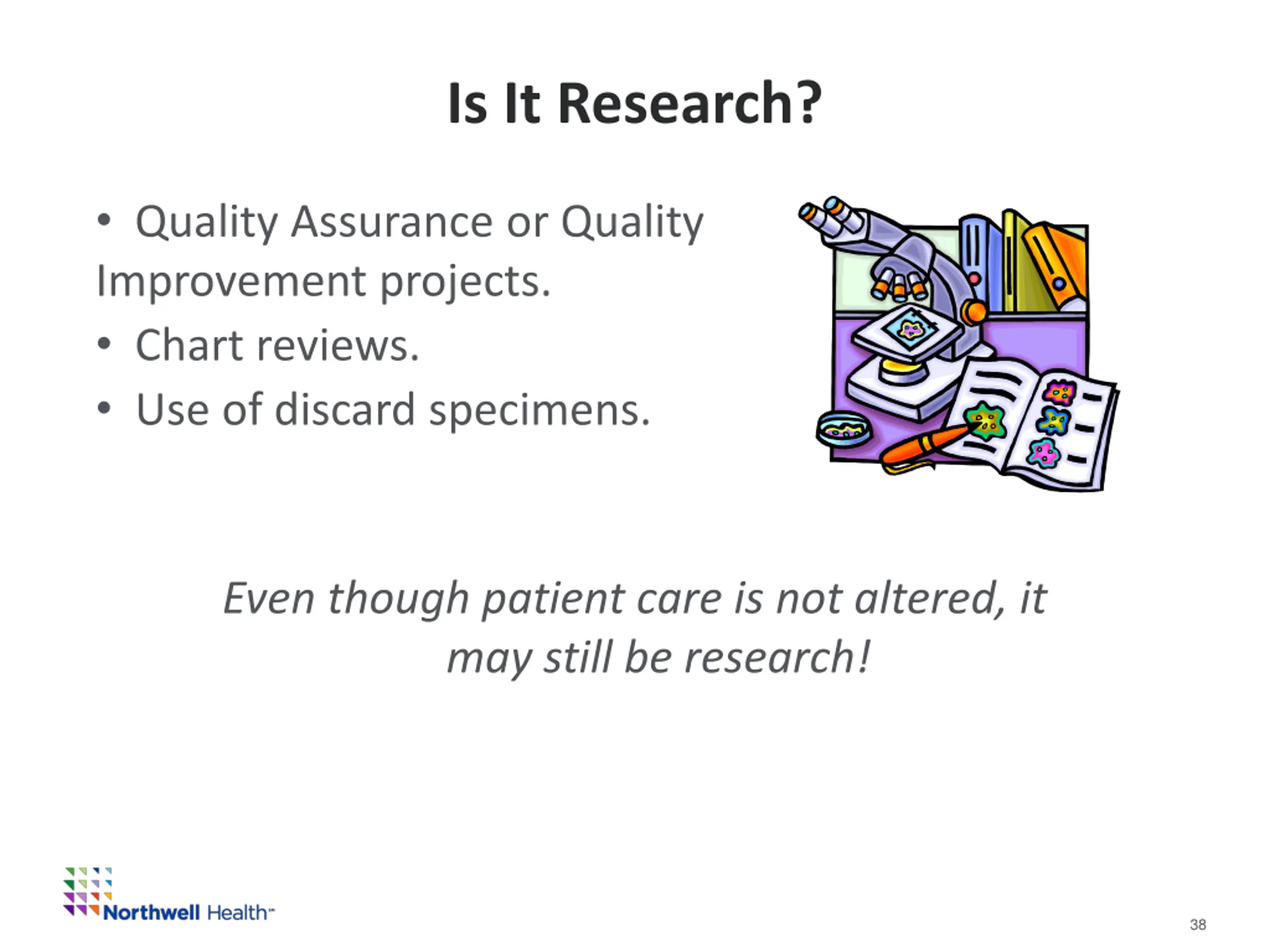 Is It Research? Quality Assurance or Quality Improvement projects. Chart reviews. Use of discard specimens. Even though patient care is not altered, it may still be research! 38