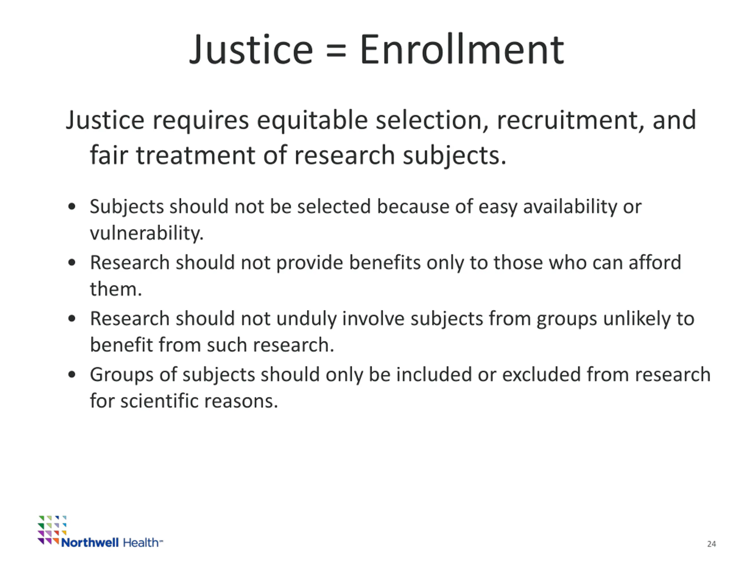 Justice = Enrollment Justice requires equitable selection, recruitment, and fair treatment of research subjects. Subjects should not be selected because of easy availability or vulnerability. Research should not provide benefits only to those who can afford them. Research should not unduly involve subjects from groups unlikely to benefit from such research. Groups of subjects should only be included or excluded from research for scientific reasons. 24