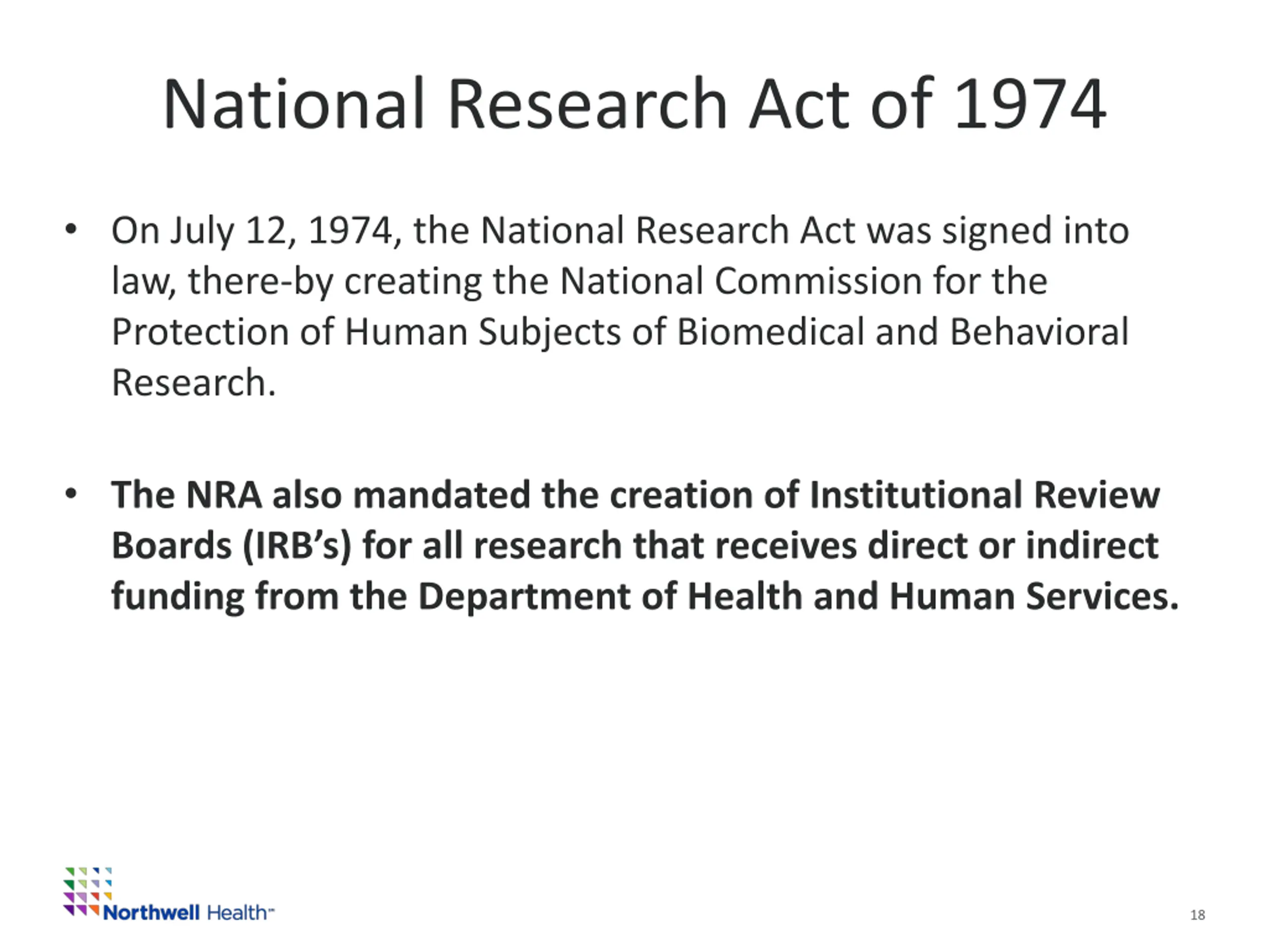National Research Act of 1974 On July 12, 1974, the National Research Act was signed into law, there-by creating the National Commission for the Protection of Human Subjects of Biomedical and Behavioral Research. The NRA also mandated the creation of Institutional Review Boards (IRB s) for all research that receives direct or indirect funding from the Department of Health and Human Services. 18