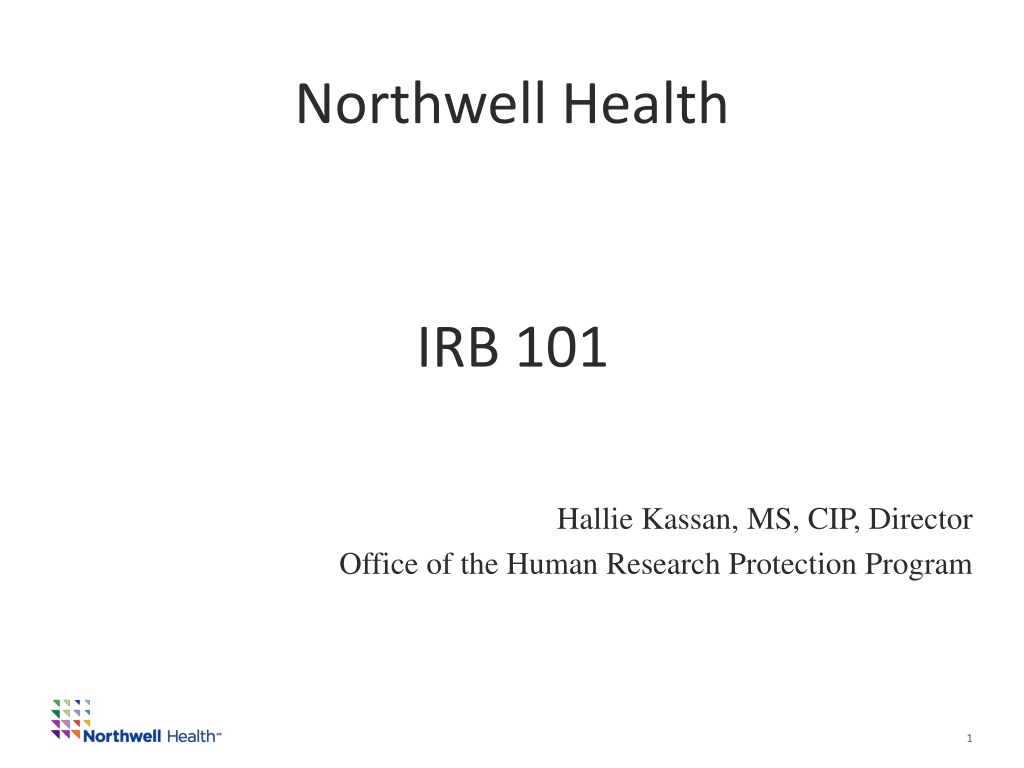 Northwell Health IRB 101 Hallie Kassan, MS, CIP, Director Office of the Human Research Protection Program 1