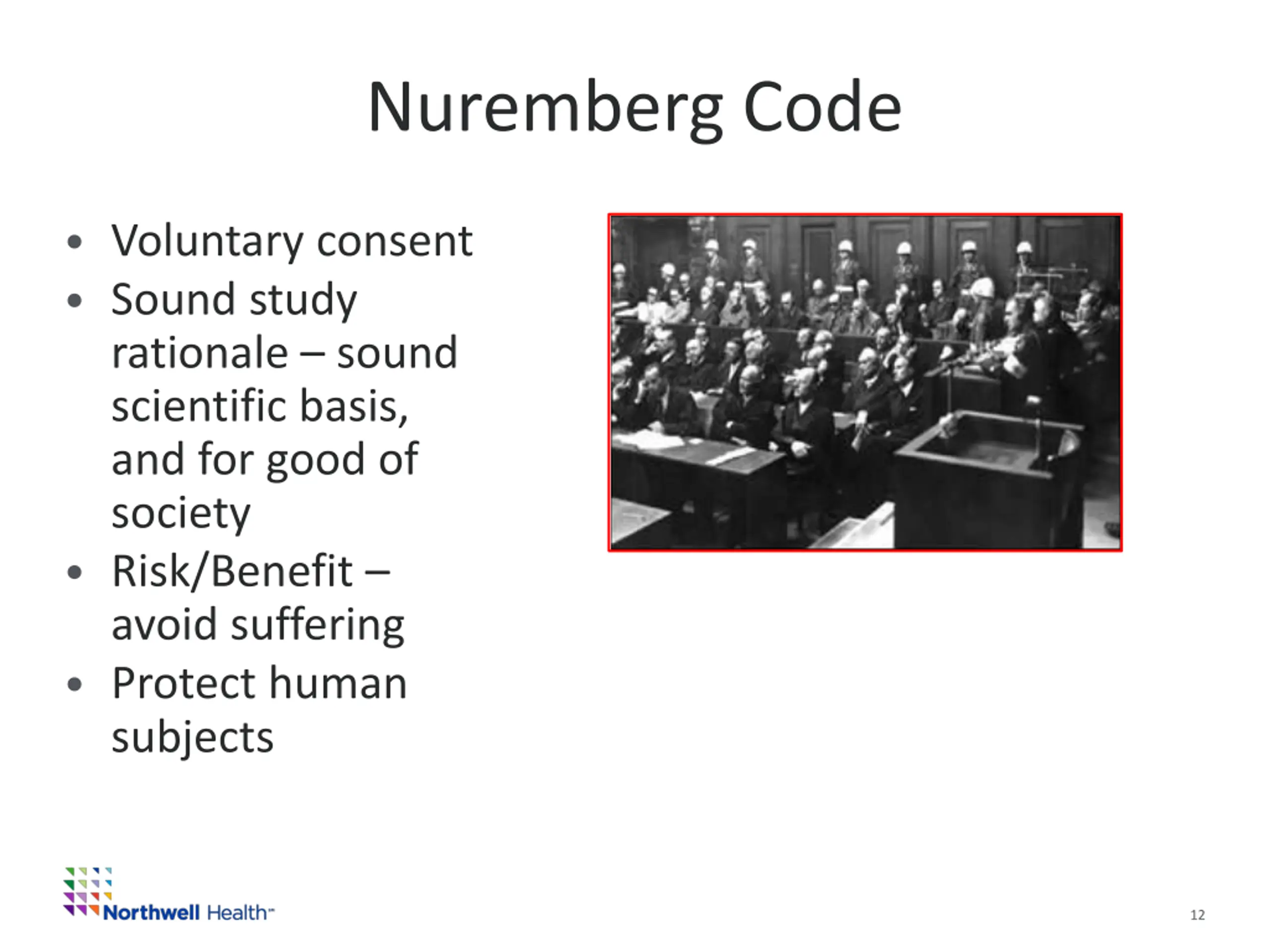 Nuremberg Code Voluntary consent Sound study rationale sound scientific basis, and for good of society Risk/Benefit avoid suffering Protect human subjects 12