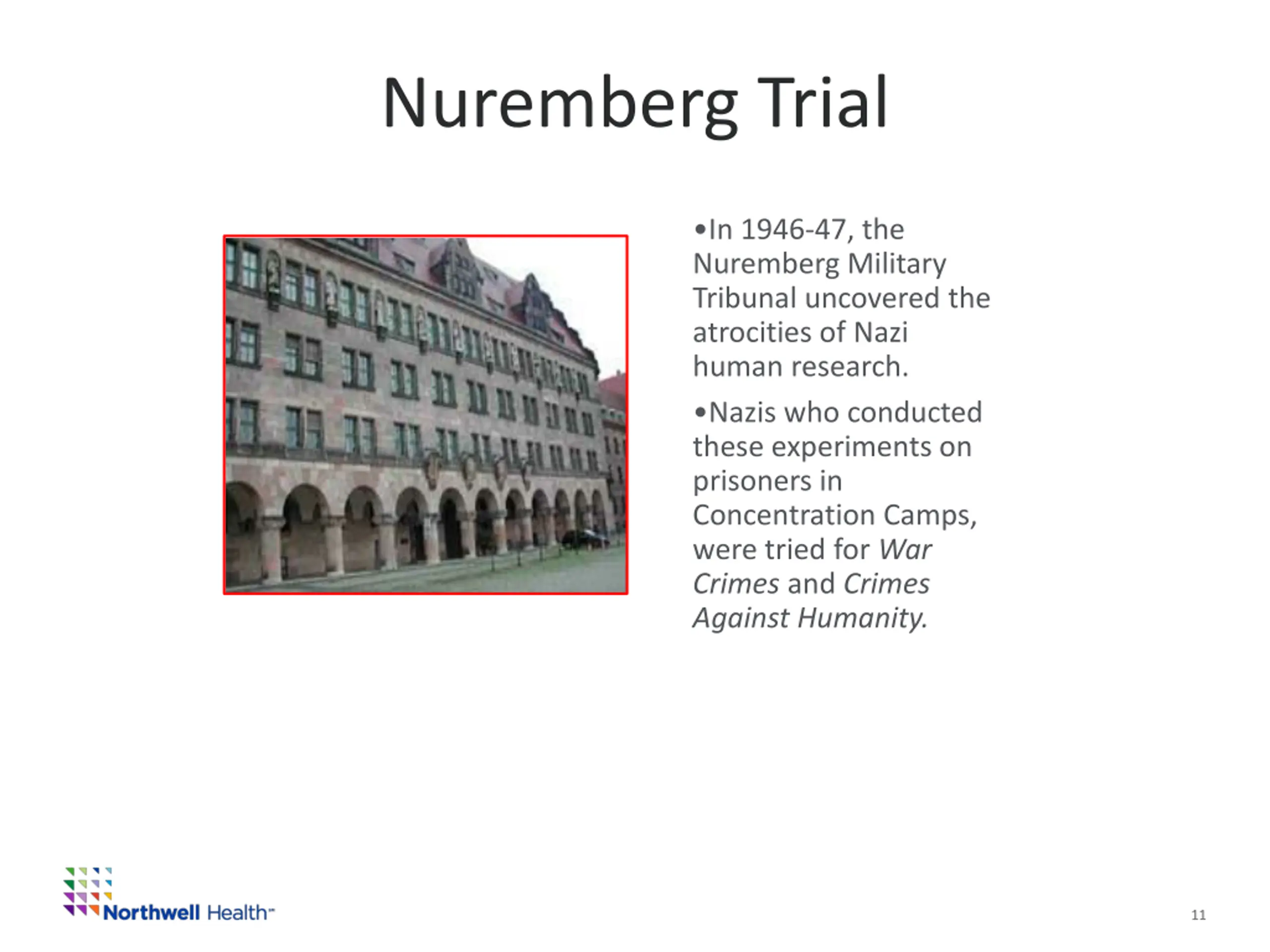 Nuremberg Trial In 1946-47, the Nuremberg Military Tribunal uncovered the atrocities of Nazi human research. Nazis who conducted these experiments on prisoners in Concentration Camps, were tried for War Crimes and Crimes Against Humanity. 11