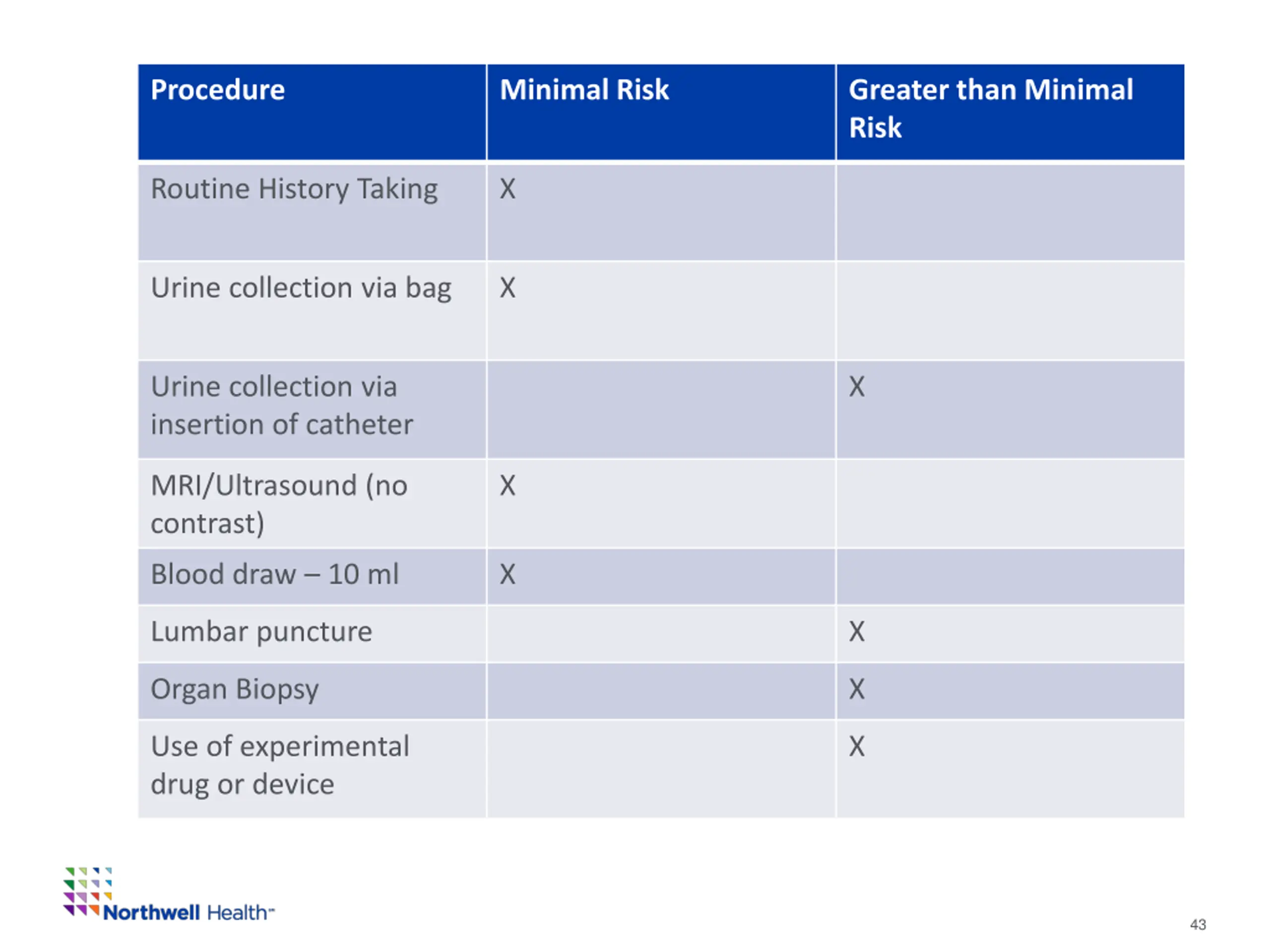 Procedure Minimal Risk Greater than Minimal Risk Routine History Taking X Urine collection via bag X Urine collection via insertion of catheter X MRI/Ultrasound (no contrast) X Blood draw 10 ml X Lumbar puncture X Organ Biopsy X Use of experimental drug or device X 43
