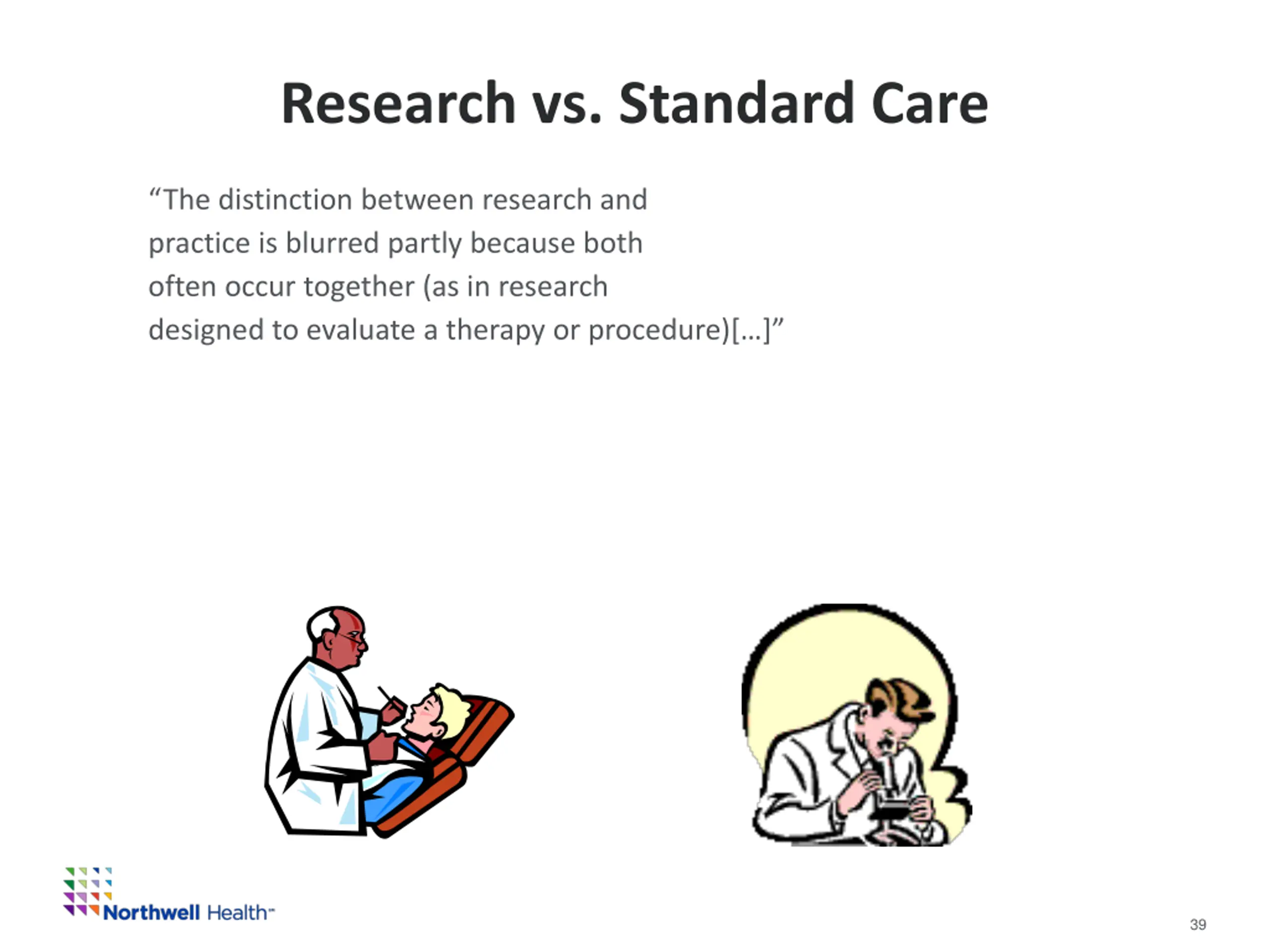Research vs. Standard Care The distinction between research and practice is blurred partly because both often occur together (as in research designed to evaluate a therapy or procedure)[ ] 39