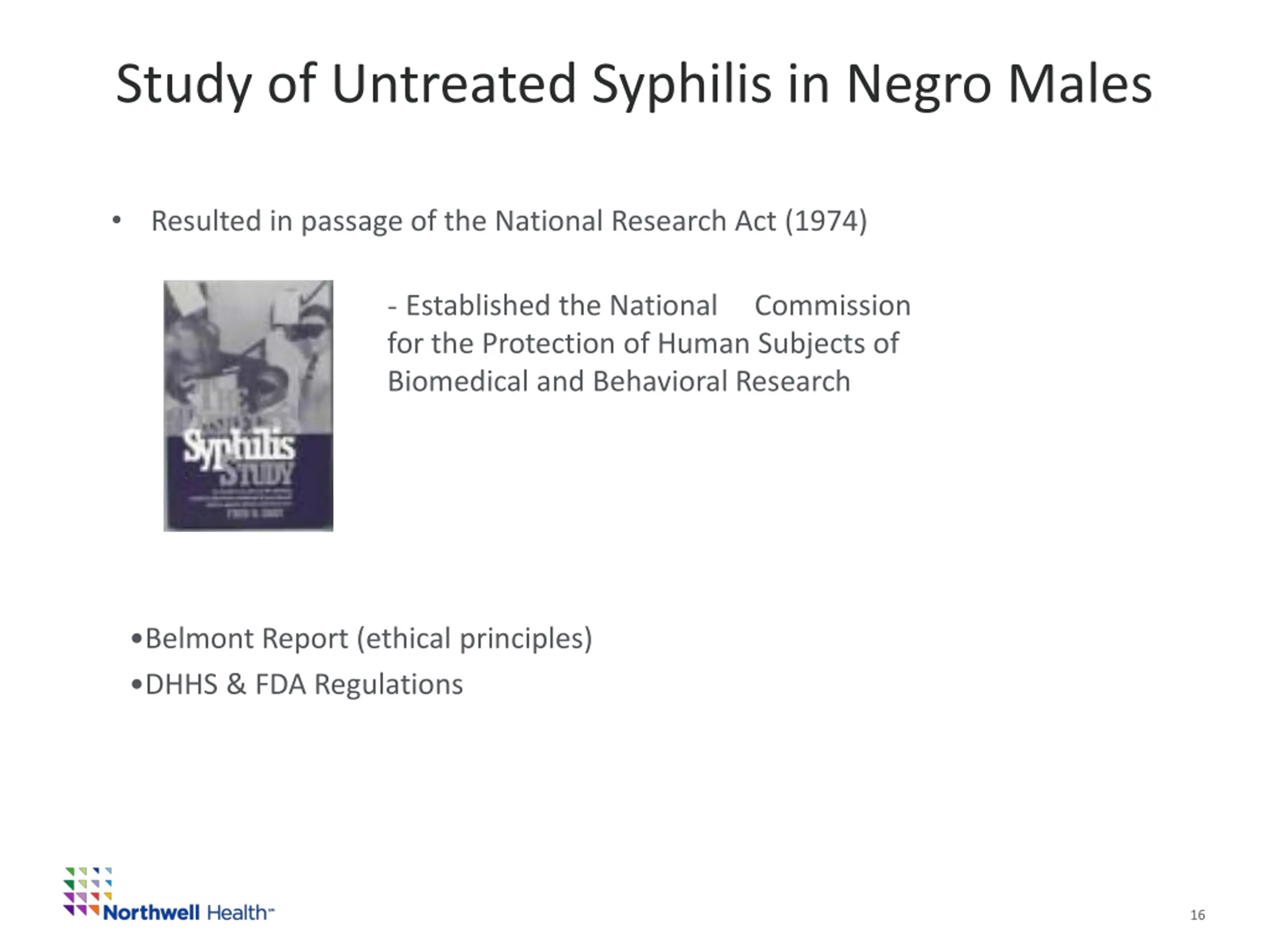 Study of Untreated Syphilis in Negro Males Resulted in passage of the National Research Act (1974) - Established the National Commission for the Protection of Human Subjects of Biomedical and Behavioral Research Belmont Report (ethical principles) DHHS & FDA Regulations 16