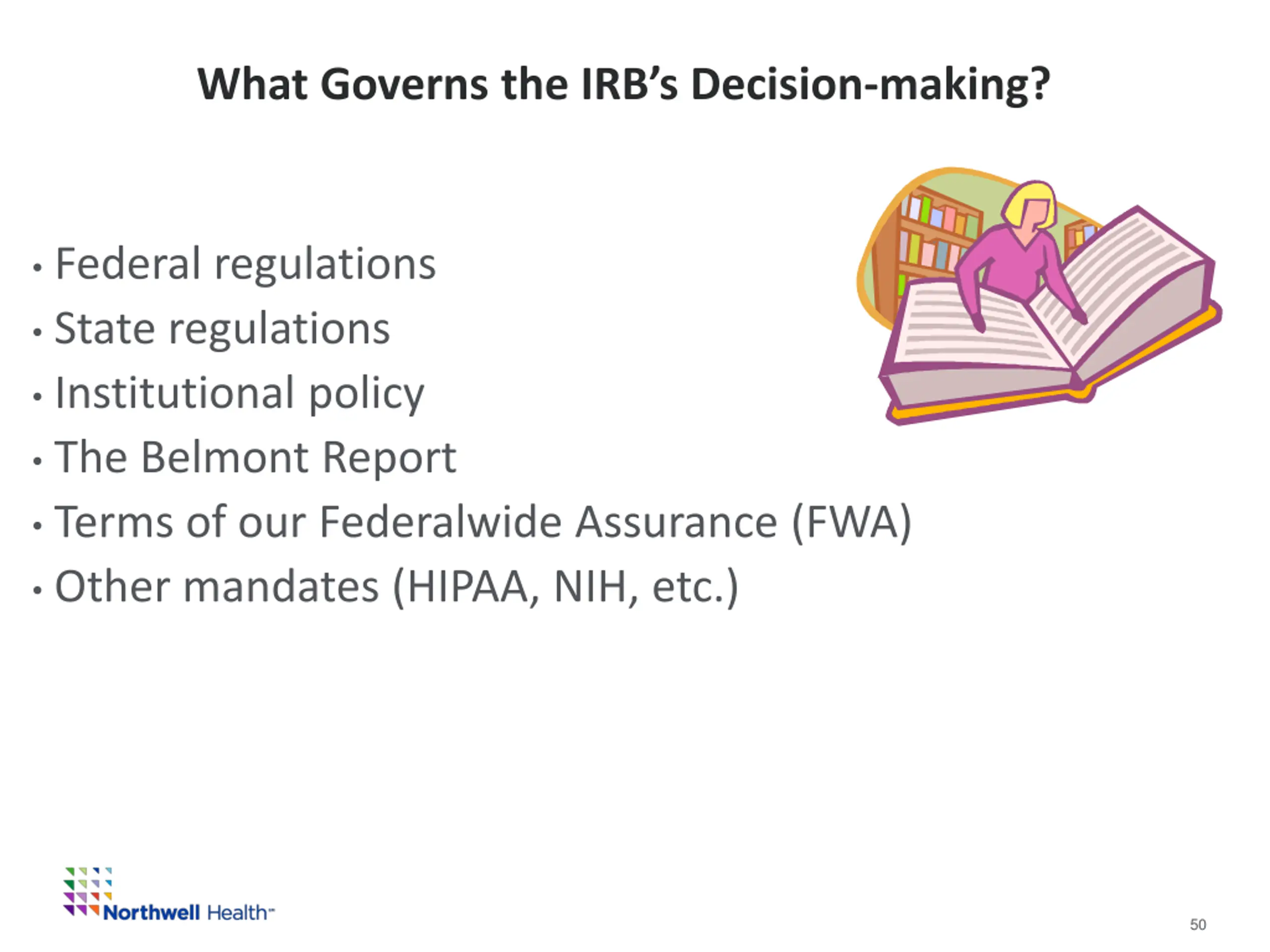 What Governs the IRBs Decision-making? Federal regulations State regulations Institutional policy The Belmont Report Terms of our Federalwide Assurance (FWA) Other mandates (HIPAA, NIH, etc.) 50