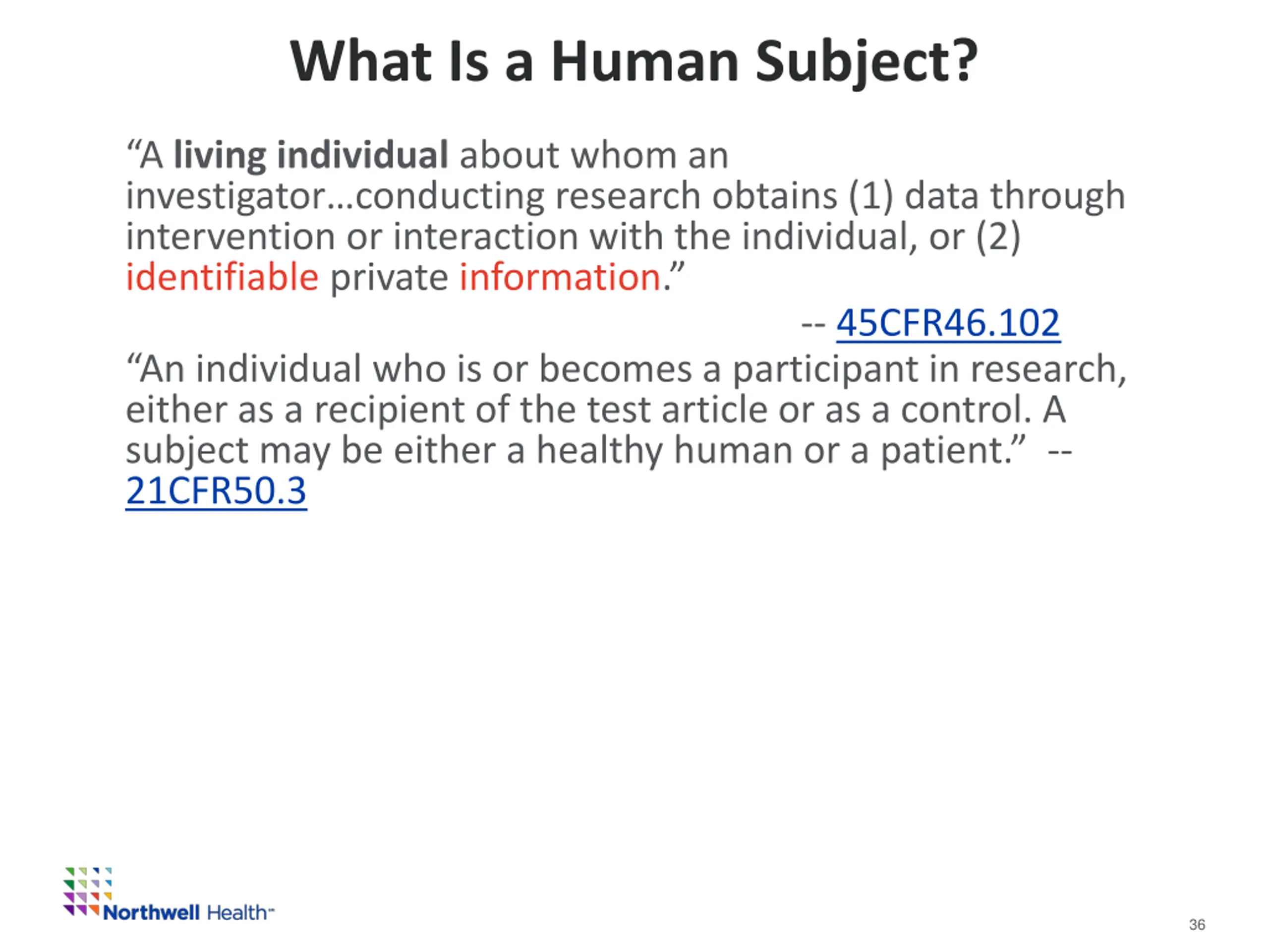 What Is a Human Subject? A living individual about whom an investigator conducting research obtains (1) data through intervention or interaction with the individual, or (2) identifiable private information. -- 45CFR46.102 An individual who is or becomes a participant in research, either as a recipient of the test article or as a control. A subject may be either a healthy human or a patient. -- 21CFR50.3 36